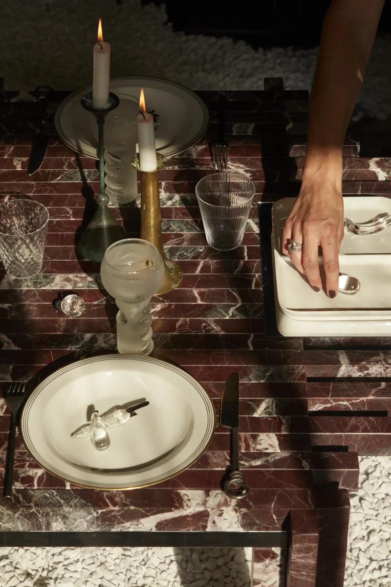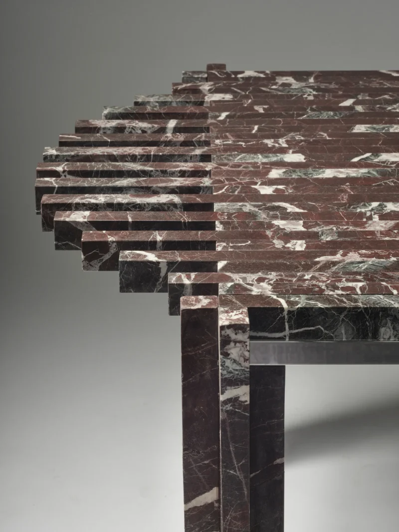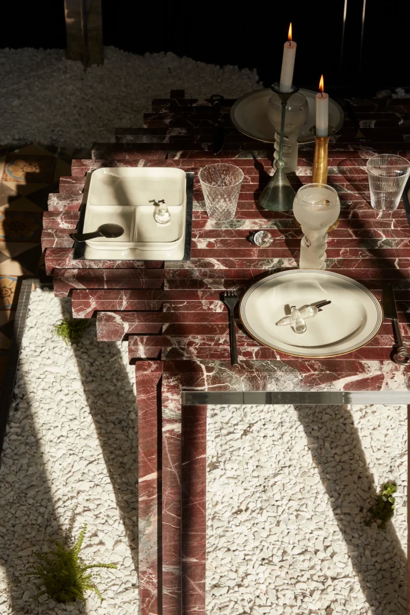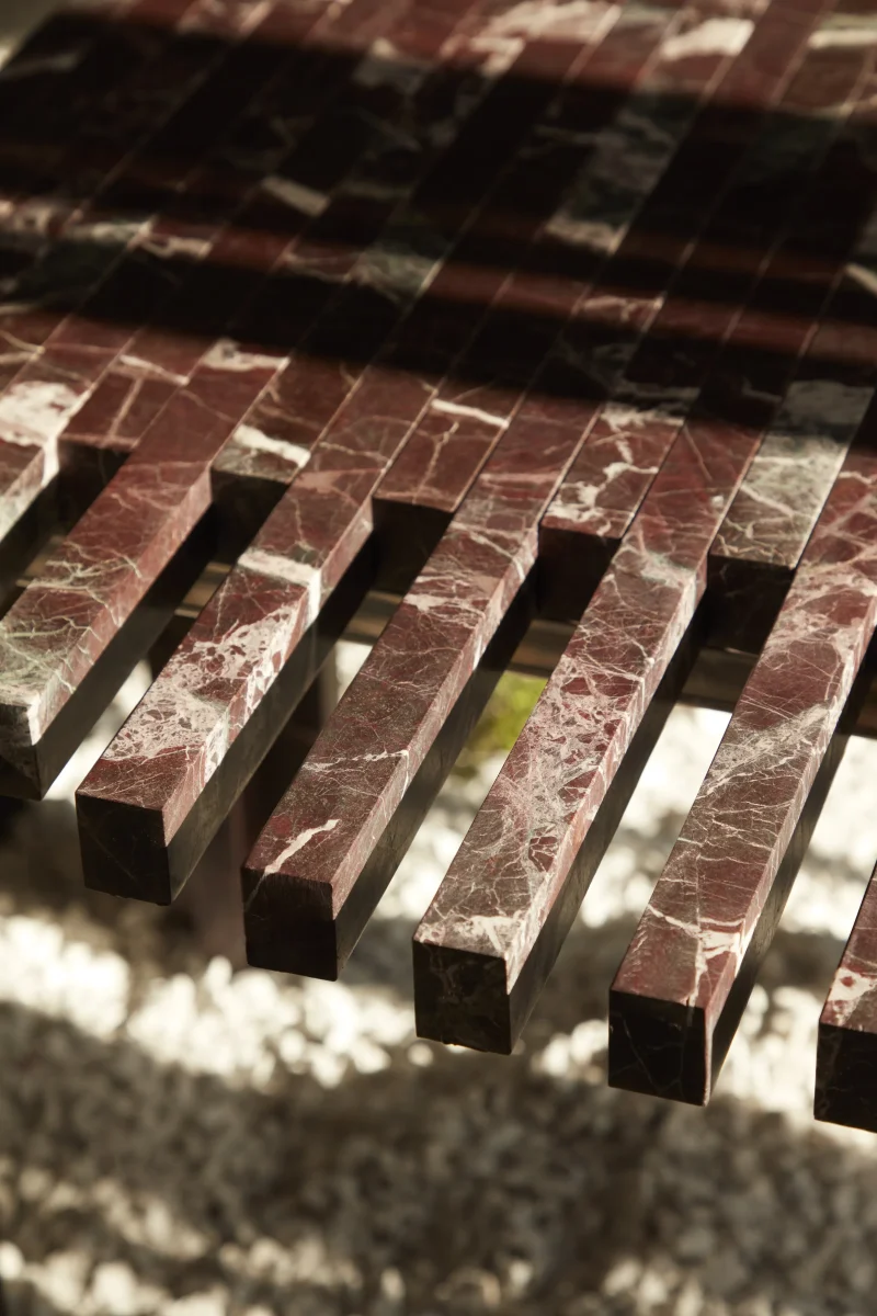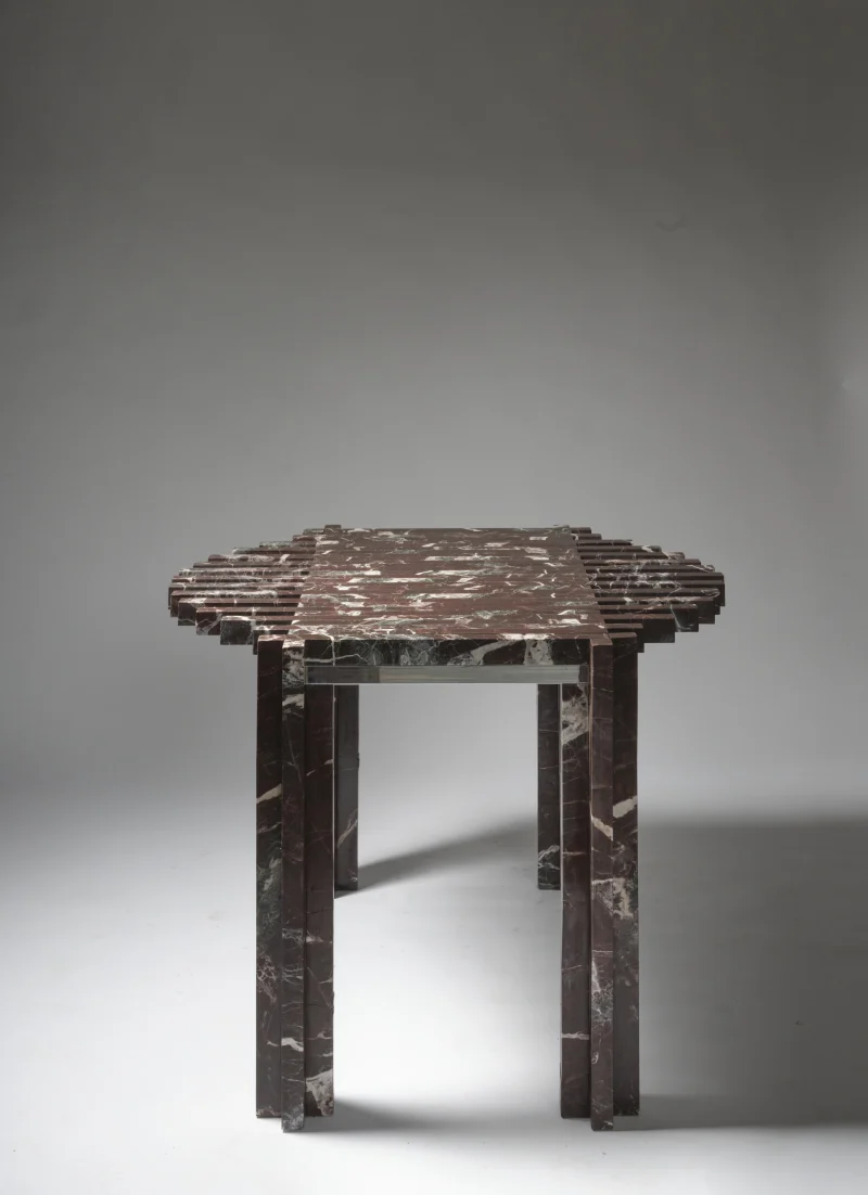 BERENICE CURT ARCHITECTURE is an architecture and design practice based in Paris. Founded by Bérénice Curt in 2021 following her years of apprenticeship within international and renowned architecture firms. Her work draws inspiration from her extensive work experiences in Japan, South America, Italy and Switzerland. The detail-focused and material-oriented approach in each project stems from Bérénice Curt’s lifelong passion for craft. Raised in an environment digging into creation, her production tools mix visual and physical mediums. She has this way woven a network of partners and craftsmen building trustworthy relationships, instrumental to the success of the office completions. The studio’s fascination with marble started during our extensive restoration of a 17th century Tuscan villa. We grew enamored with not only the richness present in the material but also with the expertise of the tuscan marble workers. However, prized for its solidity and large-scale patterning, marble is primarily used in large formats, leaving many unused offcuts left at the marble workers' shop. The Testa dei Marmi and Tavole dei Marmi collections are our way of paying homage to the material by showing its waste can be recomposed to challenge its classical use and form.