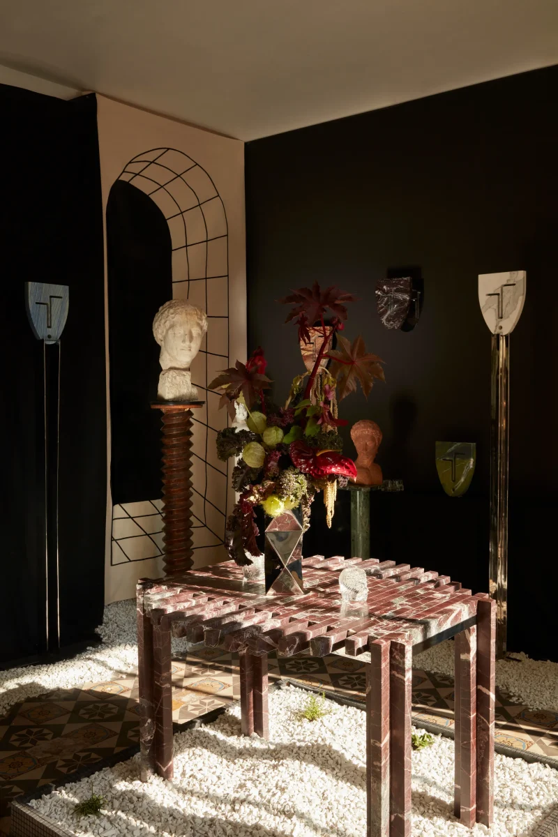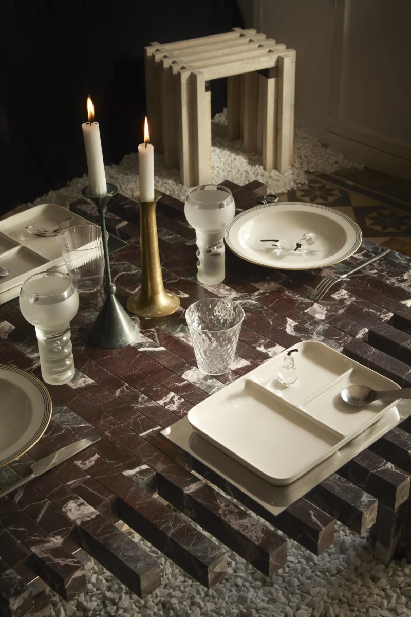 Tavole di Marmi by Berenice Curt Architecture is a furniture collection designed through the exploration of unexpected combinations of shapes that embrace the nature and simplicity of materials, resulting in unique creations. The module is inspired by the Japanese torii, adding a sense of lightness, culminating in a sculptural aesthetic.