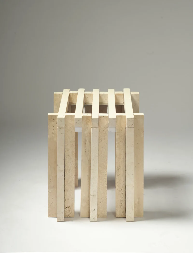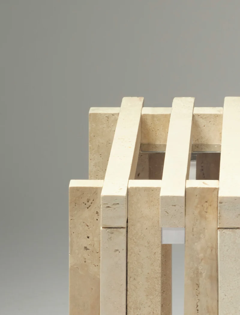 Crafted from Tuscan travertine offcuts, each slat is unique and might present natural open pores. Each slat is hand-polished on each face and has a chamfered edge. Polished stainless steel structure