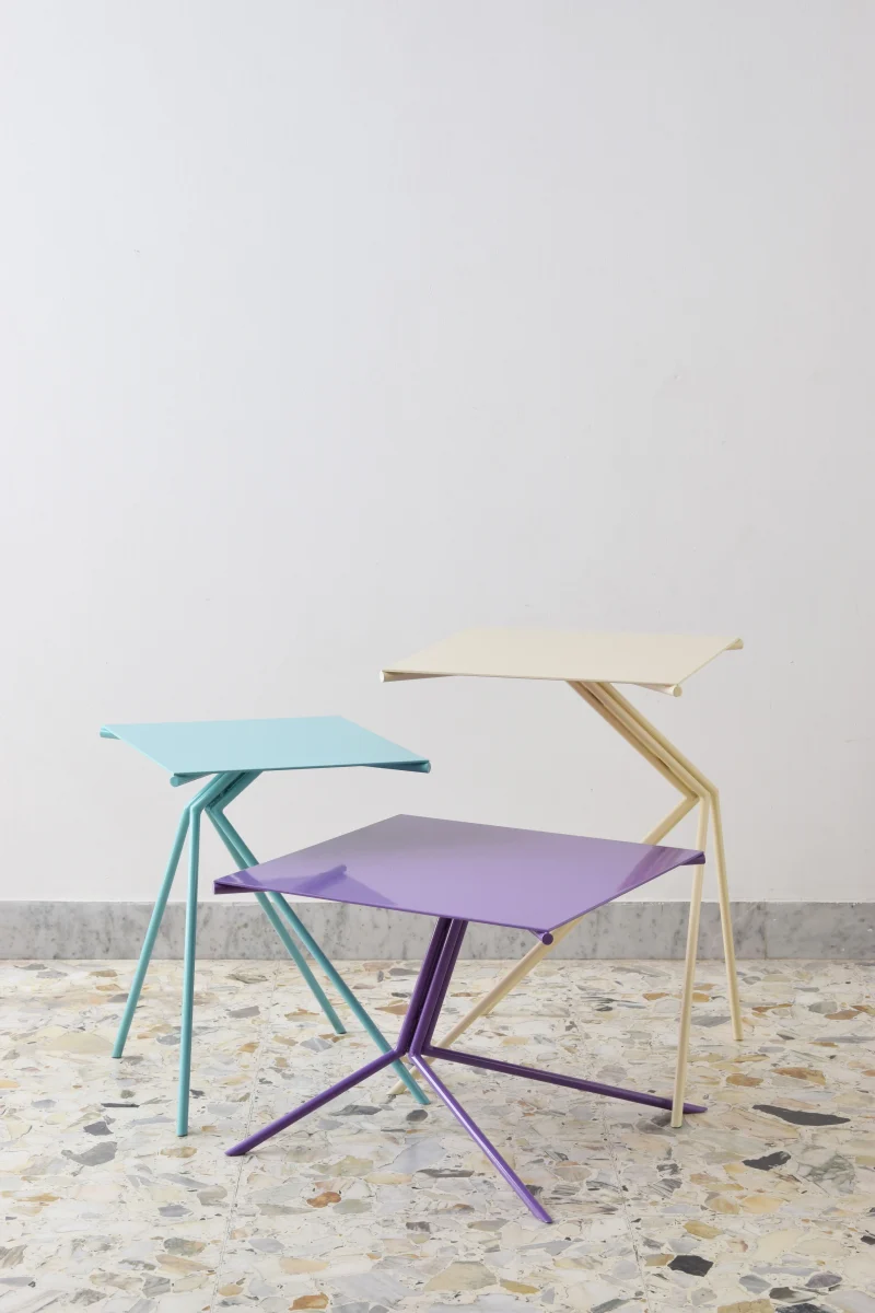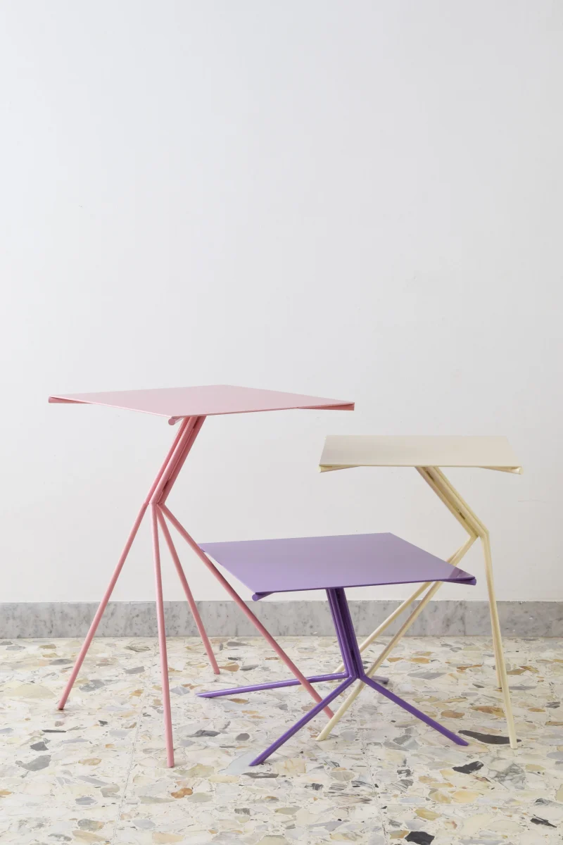 This project is a research on the expressive possibilities of shape and its ability to generate a sensation of movement and action even in complete stillness. The tables are slightly inspired by zoomorphic shapes and are born from an ironic pun on the word furniture, “mobile” in Italian, which means “something that can move”. Therefore, if a piece of furniture can be moved, can tables walk? This playful and ironic aspect is highlighted by the choice of using a wide range of pastel colors to paint the ” Tavoli che camminano “