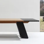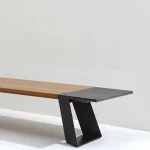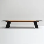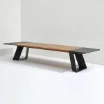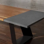 Overall, the design of this dining table harmoniously brings together wood, lava stone, and steel to create a visually striking and versatile piece that seamlessly blends natural elements with contemporary aesthetics contrast.
