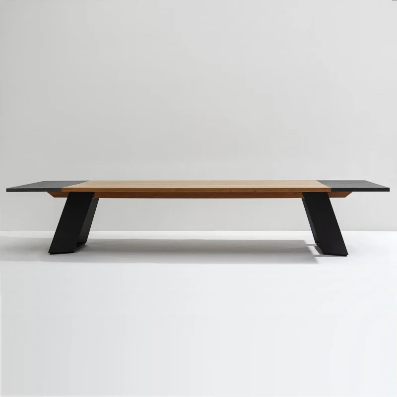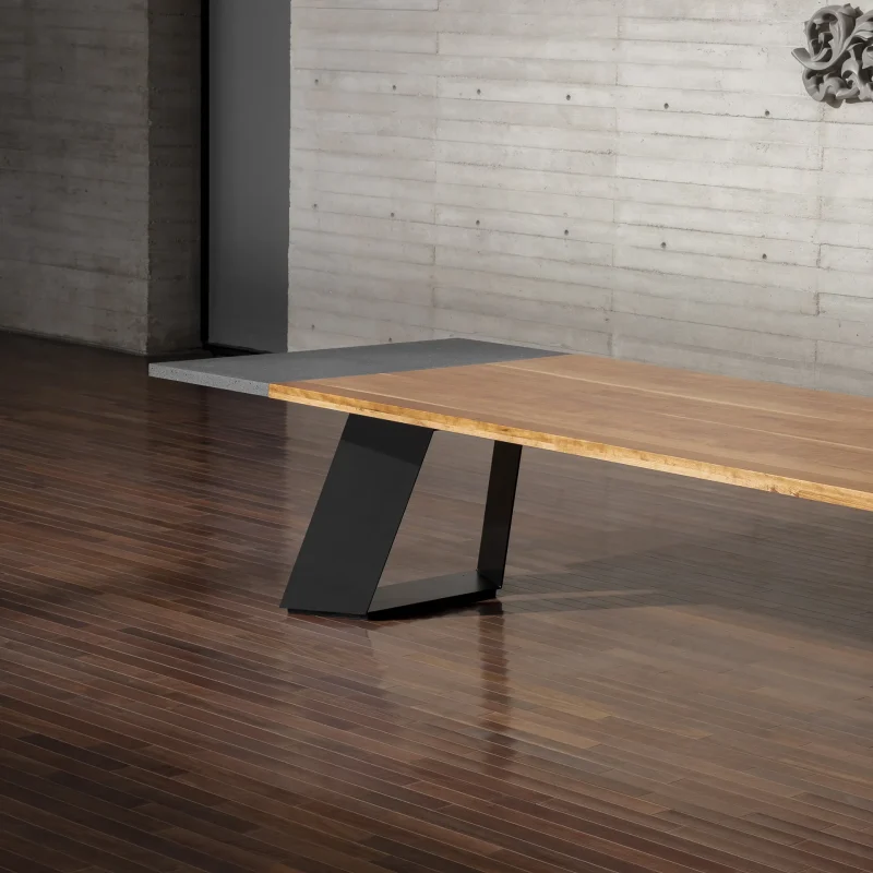 The combination of wood, lava stone, and steel in this contemporary dining table design offers a unique blend of natural and industrial materials. The contrasting textures, colors, and finishes create an eye-catching and harmonious composition. This table not only serves as a functional surface for dining but also adds a touch of artistic flair to any space.