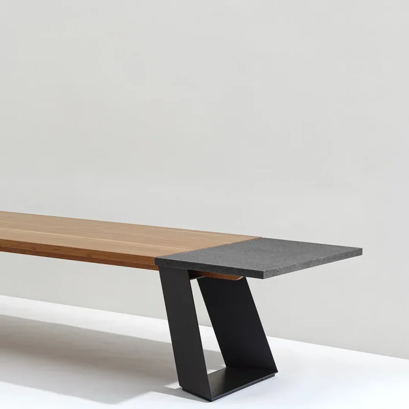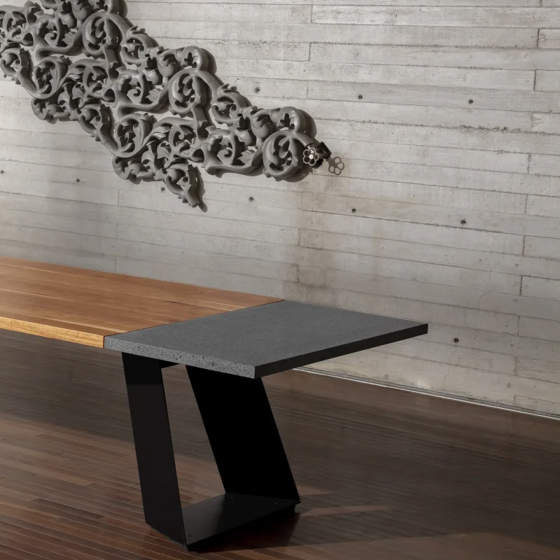 Overall, the design of this dining table harmoniously brings together wood, lava stone, and steel to create a visually striking and versatile piece that seamlessly blends natural elements with contemporary aesthetics contrast.