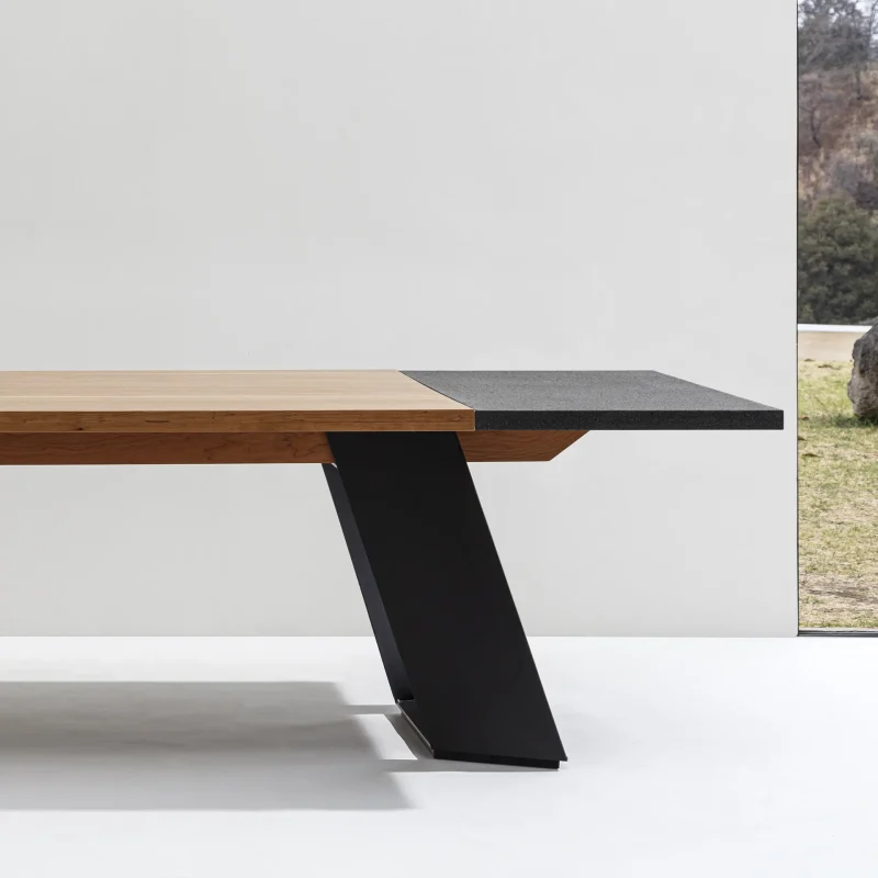 The design of the dining table that incorporates wood, lava stone, and steel in a contemporary style focuses on merging natural and modern elements to create a visually appealing and functional piece.