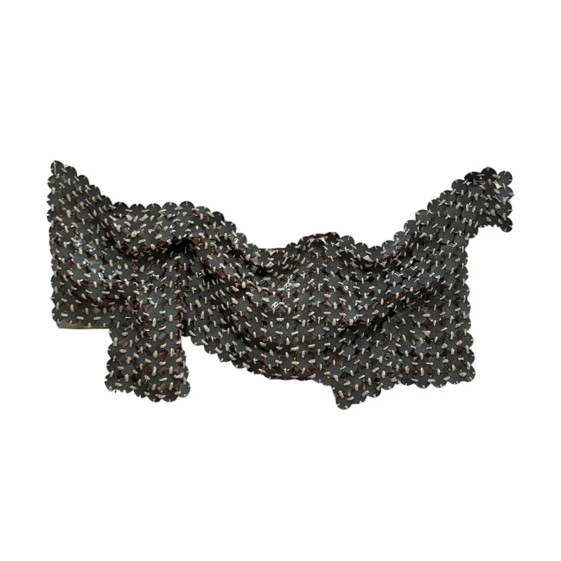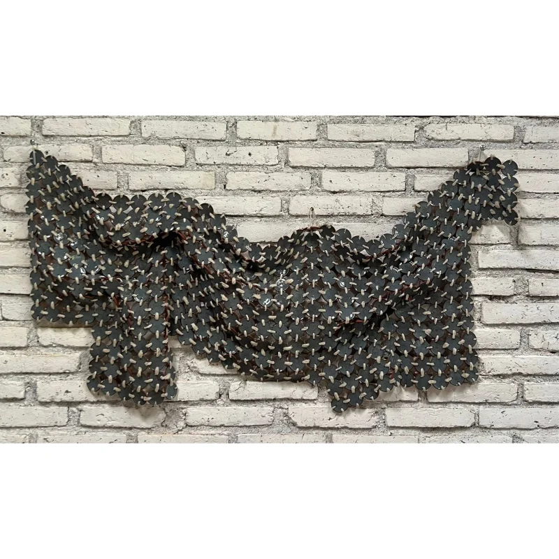 Tela de Barro Arena by Diego Olivero Studio. This piece is an interplay of the studio, manipulating different materials to achieve a textile using a solid material. Each disc is made with high-fire ceramics and then assembled using handspun wool from Guatemala.