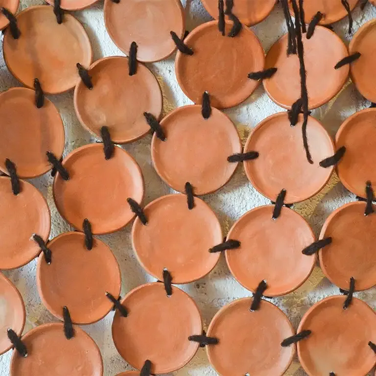 Tela de Barro is a wall art installation piece by Brooklyn based designer, Diego Olivero Studio, that explores a new variation of textiles, combining terracotta and wool to create captivating textures. Handmade terracotta discs, crafted by women artisans, are intricately joined using hand-spun wool, resulting in a fabric-like effect where gravity, techniques, and materials harmoniously coexist.