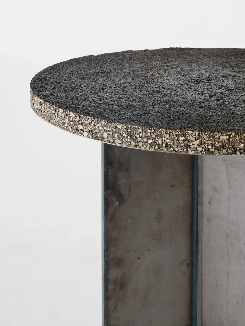 How many Kilos of tarmac in Spain per Hour? This is the starting question in the design of of this sturdy and impressive piece, a solid disc made of 59,55 kg of asphalt resting on a welded iron base. The unexpected play of shapes, and materials results in such textures gives for a unique piece that will stand out in any collection.