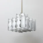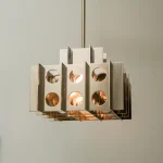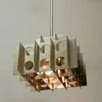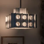 The rhythmic circular cutouts and polished surfaces amplify the geometric design, casting intricate, dynamic patterns that dance across the room. Whether suspended over a dining table, in an entryway, or as a dramatic focal point in a living space, the Tenfold Pendant Light brings an edge of industrial artistry while maintaining a refined elegance.