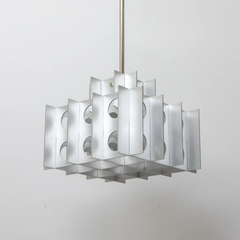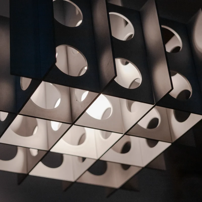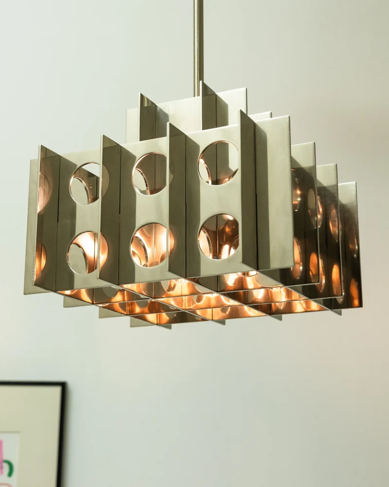 Where Brutalism meets glam. The Tenfold Pendant Light by Luft Tanaka merges the bold, uncompromising forms of Brutalist architecture with the captivating illusions of Op Art. Featuring meticulously perforated metal panels, this pendant plays with light and shadow, transforming functional lighting into a sculptural centerpiece.