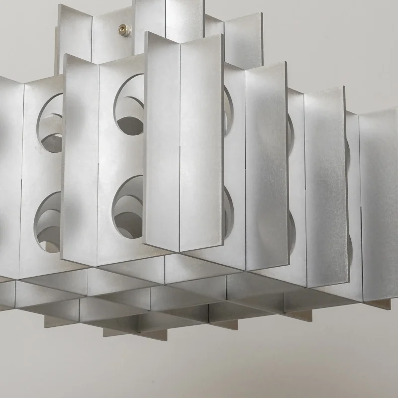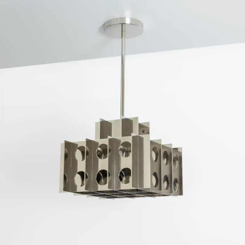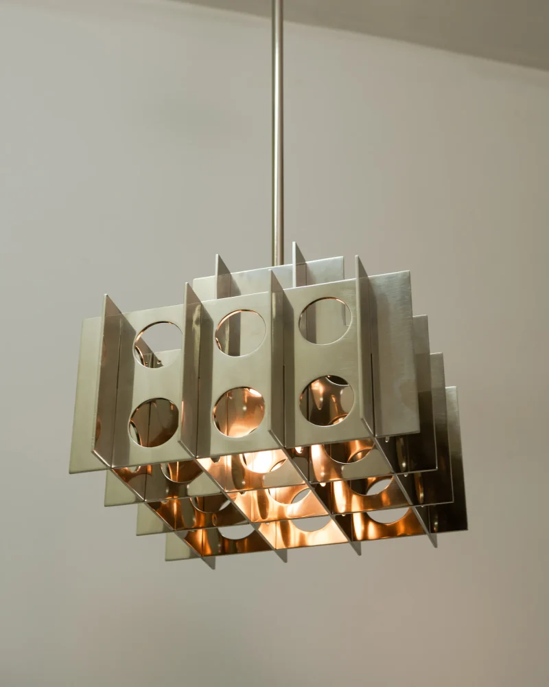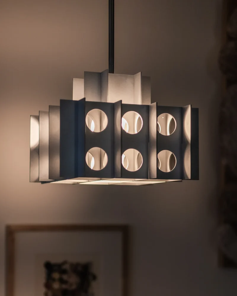 The rhythmic circular cutouts and polished surfaces amplify the geometric design, casting intricate, dynamic patterns that dance across the room. Whether suspended over a dining table, in an entryway, or as a dramatic focal point in a living space, the Tenfold Pendant Light brings an edge of industrial artistry while maintaining a refined elegance.