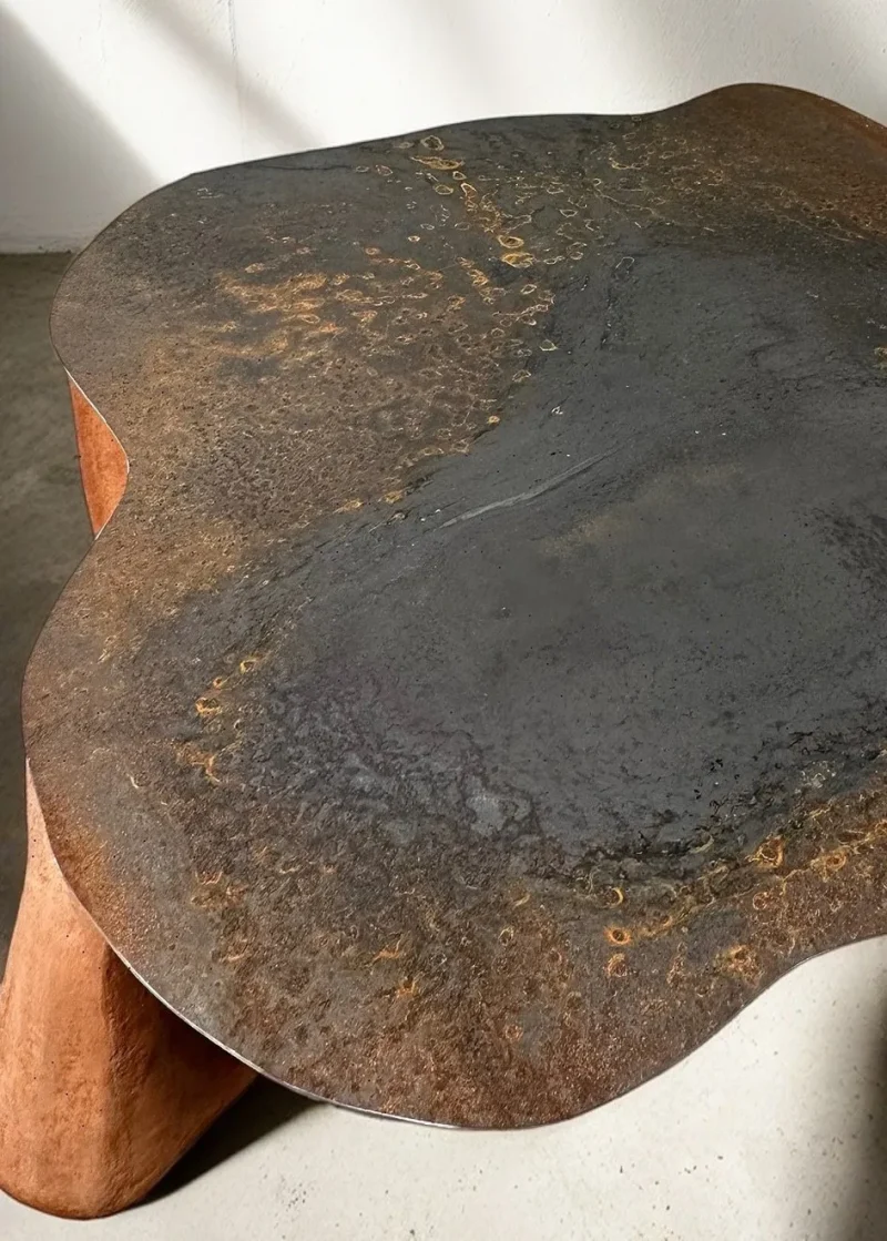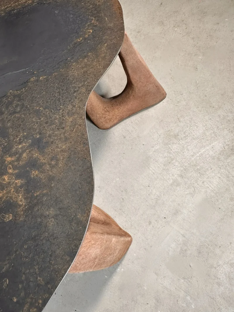 Designed with modularity in mind, the hand-shaped bases are fully rearrangeable, allowing for different compositions that shift the table’s presence in a space. Paired with a steel top, the piece is not about contrast alone—it’s about connection. The imperfections in the top weren’t just accepted; they were necessary, allowing the industrial element to find its place alongside the organic, tactile bases. Together, they create a seamless dialogue, where each element enhances the other, balancing rugged textures with fluid lines.