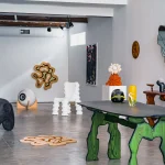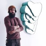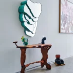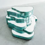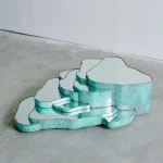 The terraced irrigation of hillsides has always fascinated me. It is a moment in which human intervention meets natural topography in a harmonious, poetic way. Inspired by these moments, as well as by the travertine terraces of places like Yellowstone, US, and Pamukkale, Turkey, the mirror drips down the wall, projecting a topography onto its planar surface. As with any topography, the nature of the mirror changes as we navigate around it, and gaze into it from different perspectives. Straight on, our reflection is whole – but as we move across it we see the brass edging begin to defy its own materiality, and we see ourselves fragment, splinter into pieces, and scatter across the room. We no longer see ourselves, only pieces of ourselves dispersed across time and space.