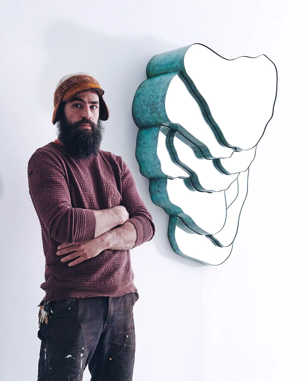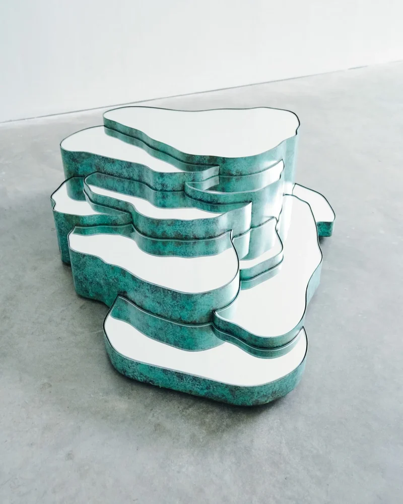 The terraced irrigation of hillsides has always fascinated me. It is a moment in which human intervention meets natural topography in a harmonious, poetic way. Inspired by these moments, as well as by the travertine terraces of places like Yellowstone, US, and Pamukkale, Turkey, the mirror drips down the wall, projecting a topography onto its planar surface. As with any topography, the nature of the mirror changes as we navigate around it, and gaze into it from different perspectives. Straight on, our reflection is whole – but as we move across it we see the brass edging begin to defy its own materiality, and we see ourselves fragment, splinter into pieces, and scatter across the room. We no longer see ourselves, only pieces of ourselves dispersed across time and space.