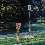 The reflectivity of polished stainless steel blends the pedestals completely into the landscape while providing a kinetic structure that captivates the observer’s gaze. These pieces appear to exist both inside and outside their spatial context – distorted reflections create a spatial experience and evoke a sense of intriguing and revealing visual perplexity, intriguing and revealing at once.