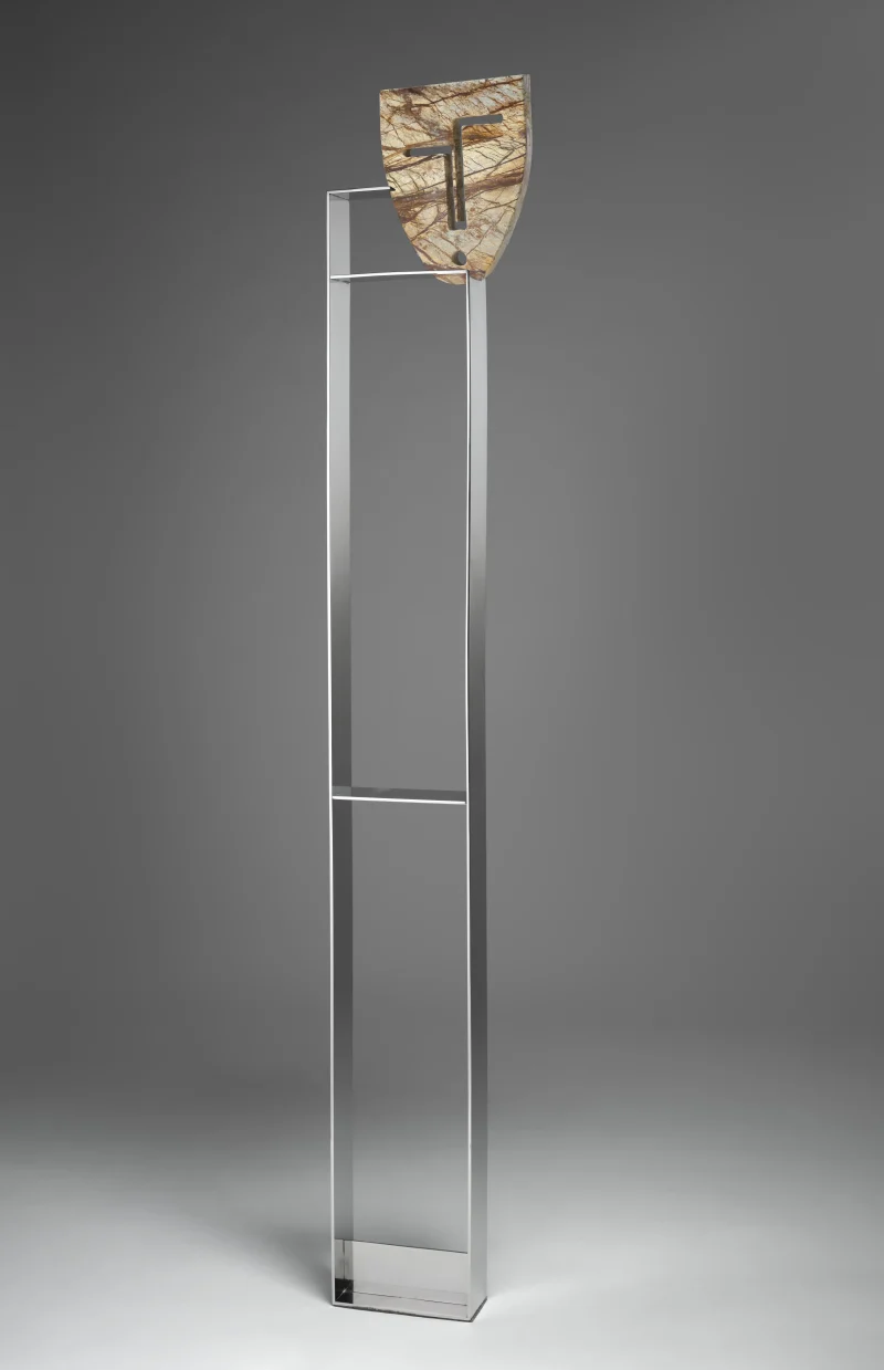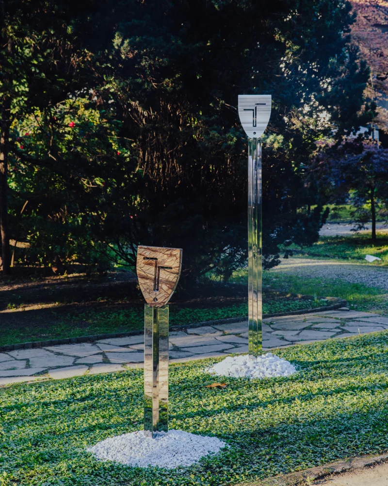The reflectivity of polished stainless steel blends the pedestals completely into the landscape while providing a kinetic structure that captivates the observer’s gaze. These pieces appear to exist both inside and outside their spatial context – distorted reflections create a spatial experience and evoke a sense of intriguing and revealing visual perplexity, intriguing and revealing at once.