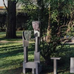 The reflectivity of polished stainless steel blends the pedestals completely into the landscape while providing a kinetic structure that captivates the observer’s gaze. These pieces appear to exist both inside and outside their spatial context – distorted reflections create a spatial experience and evoke a sense of intriguing and revealing visual perplexity, intriguing and revealing at once.