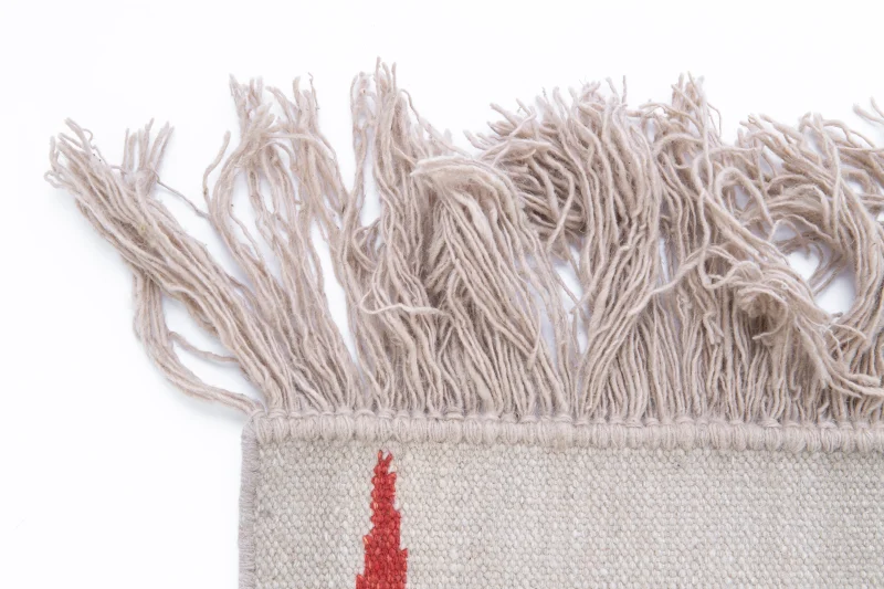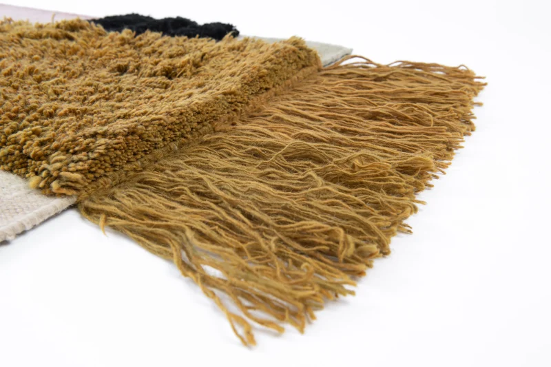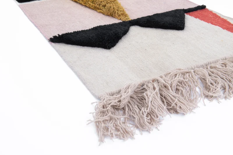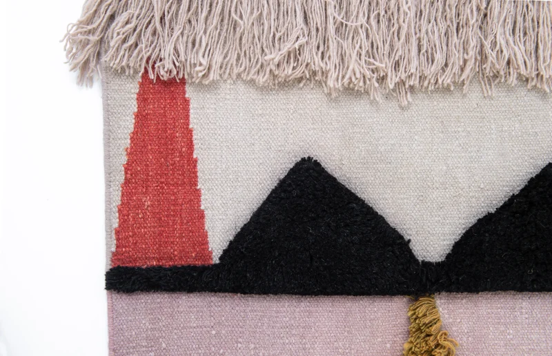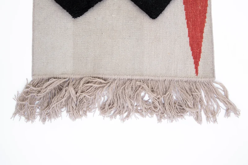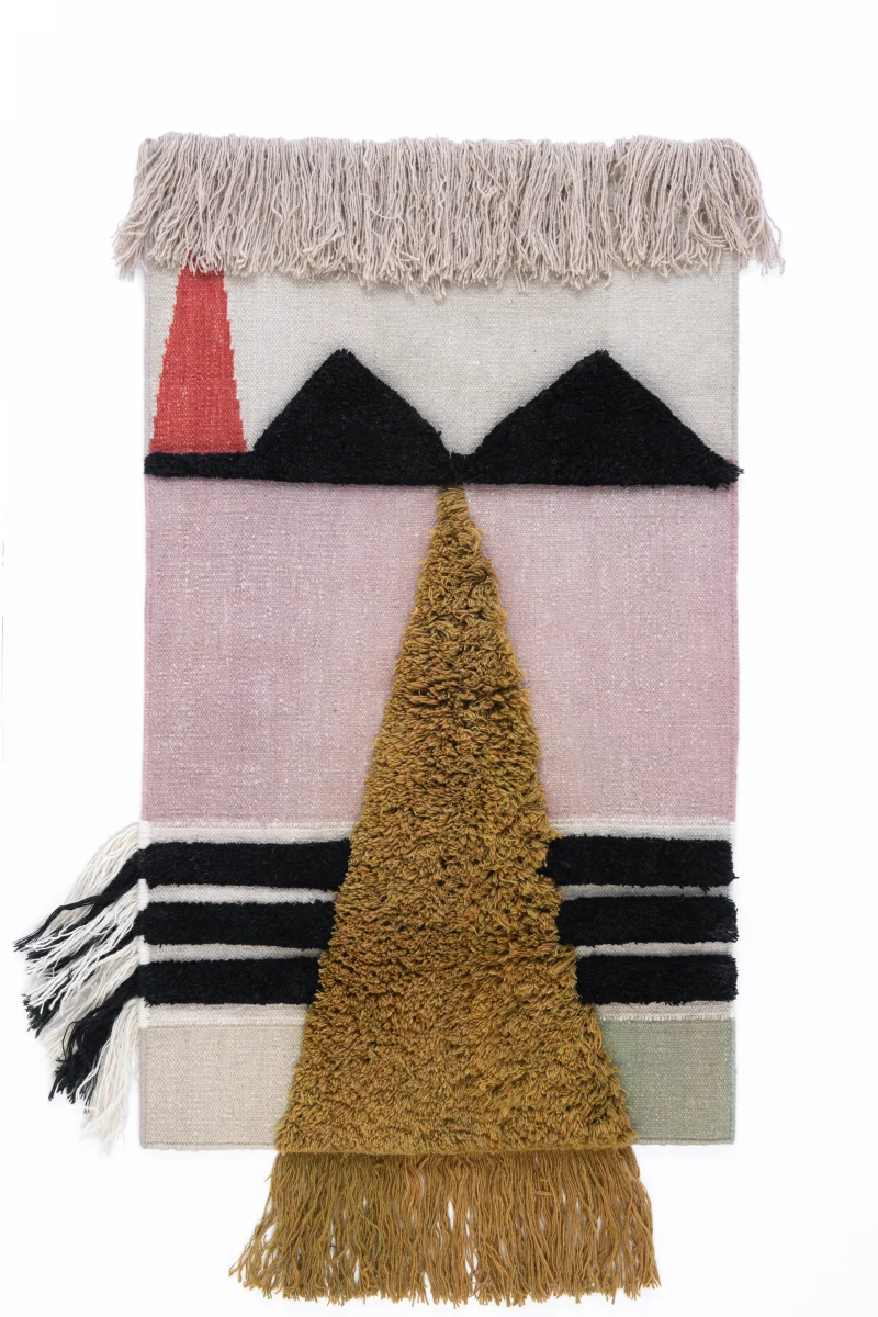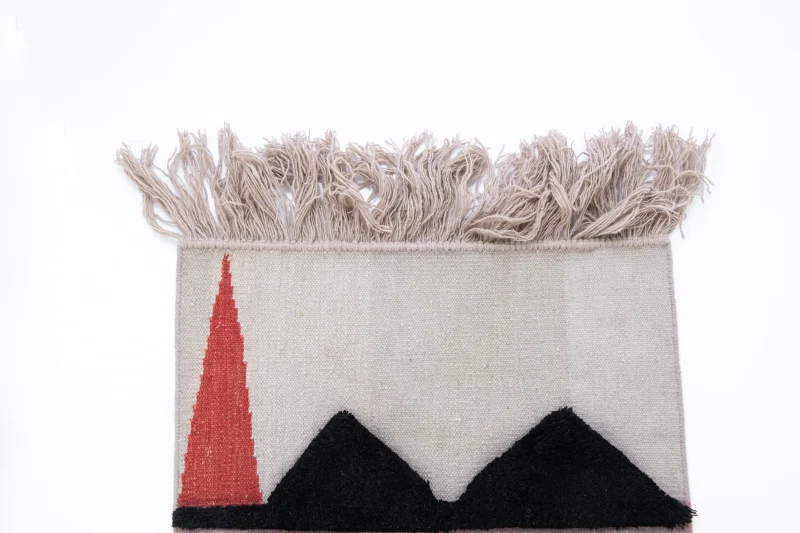 Textile Poster no. 12 embodies a constant exploration of design possibilities within traditional carpet-making techniques, introducing wool in a novel and unprecedented texture. The geometric shapes’ hard lines find harmony in the softening effect of wool and hanging fringe, resulting in a uniquely balanced piece. Versatile in nature, it seamlessly complements eclectic spaces, offering a distinctive touch to various environments.