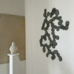 The “Texture Vase” by Meagan Cignoli Studio is a striking exploration of materiality and surface, showcasing a bulbous form that balances organic and geometric proportions. Its tactile surface, characterized by a dense, uneven texture resembling clustered natural growths or eroded stone, invites close examination and touch. The muted, off-white finish enhances the raw and earthy quality, evoking a sense of timelessness and fragility.