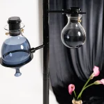 The Emotional Lab floor lamp consists of a slender metal stand supporting several beaker-like glass vessels that light up with a warm, ambient glow.