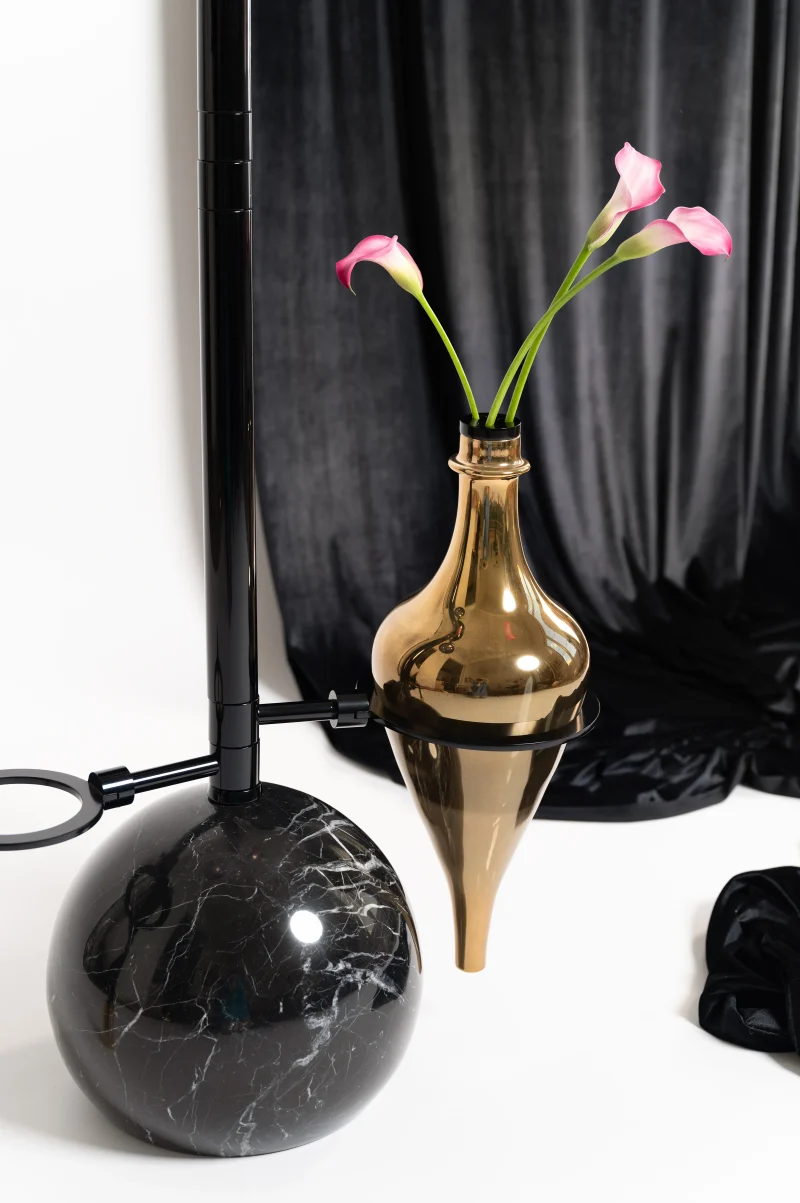 The lamp is part of the Emotional Lab series, which also includes a modular storage system, and is handcrafted by artisans in Spain, Italy and Lebanon. The structure is available in anodised aluminium, brass or stainless steel, with various marbles for the base.