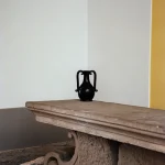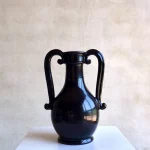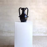 The Fiasca takes inspiration from storage vessels made in fairly standard shapes, they were designed to fit with dozens of others on a shelf, often in a pharmacy or shop. Their handles therefore tend to fit within the vessel’s profile, and the jar is generally narrower at the middle than at the top or bottom, making it easy to grip. The ceramic is handthrown and the orignal decor has been blacked out. The shiny black glaze has been rubbed by hand by the artisans to give this matte finish.