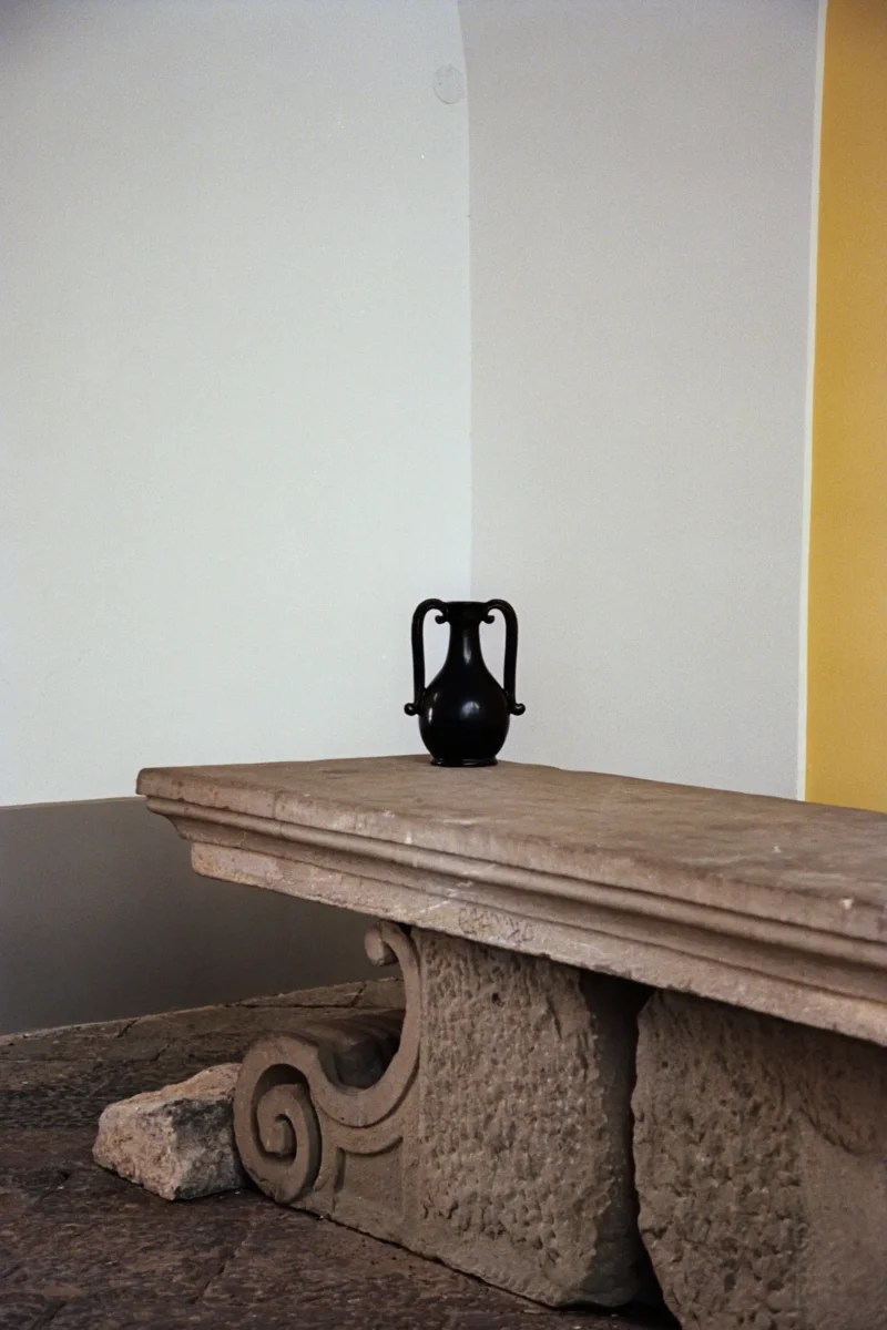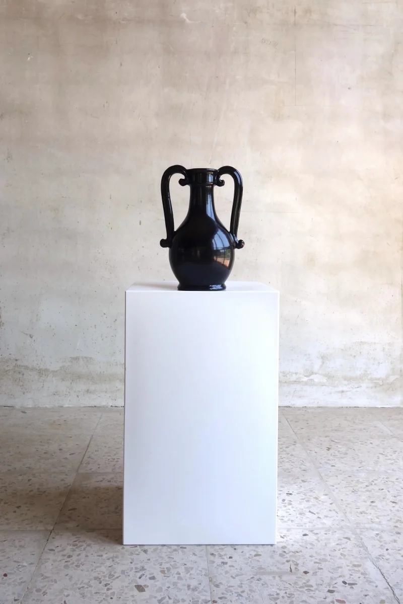 The Fiasca takes inspiration from storage vessels made in fairly standard shapes, they were designed to fit with dozens of others on a shelf, often in a pharmacy or shop. Their handles therefore tend to fit within the vessel’s profile, and the jar is generally narrower at the middle than at the top or bottom, making it easy to grip. The ceramic is handthrown and the orignal decor has been blacked out. The shiny black glaze has been rubbed by hand by the artisans to give this matte finish.