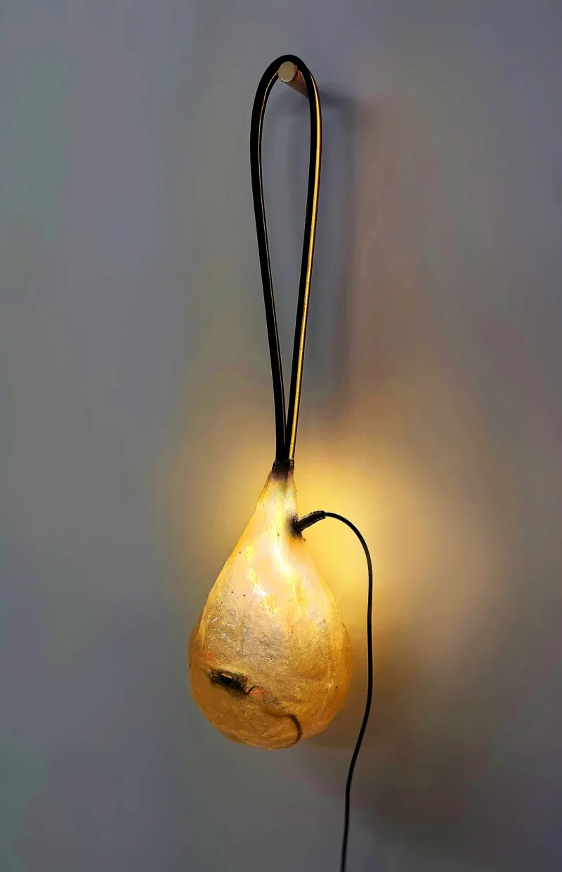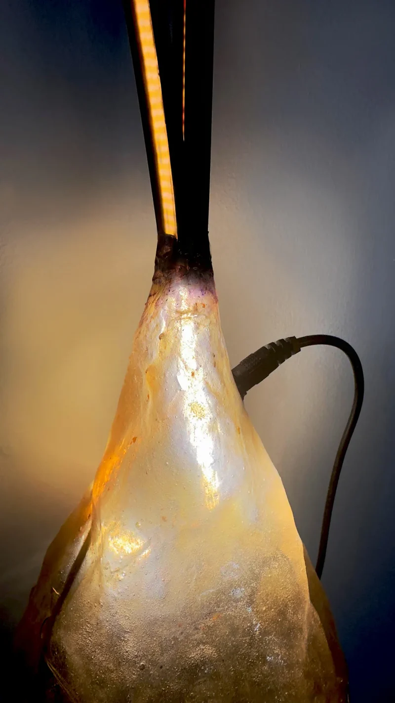 Sabrina’s broader collection, “Sympoietic,” is a masterful blend of human, non-human, and technological elements, creating a deep network of interconnectedness. Drawing from both contemporary and ancient methodologies, she has developed a unique formula for a 100% biodegradable collagen-based bioplastic. This innovative material harks back to historical paint and adhesive techniques, enabling Sabrina to create interactive lighting sculptures that respond to the presence of viewers.
