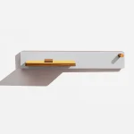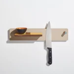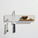 The Knife Rack is a wall mounted magnetic panel that holds knives(and protects their edge), a shelf for key seasoning and a hook for a potholder or favorite utensil. It’s hard -working and easy on the eyes. In solid walnut with powder-coated magnetic components.