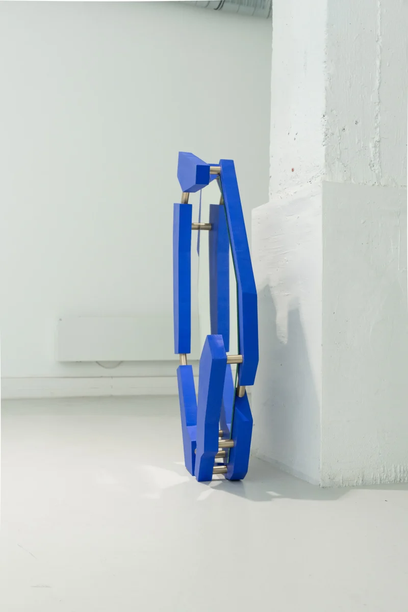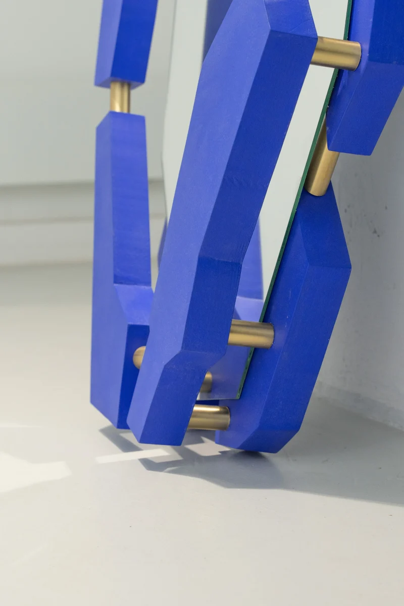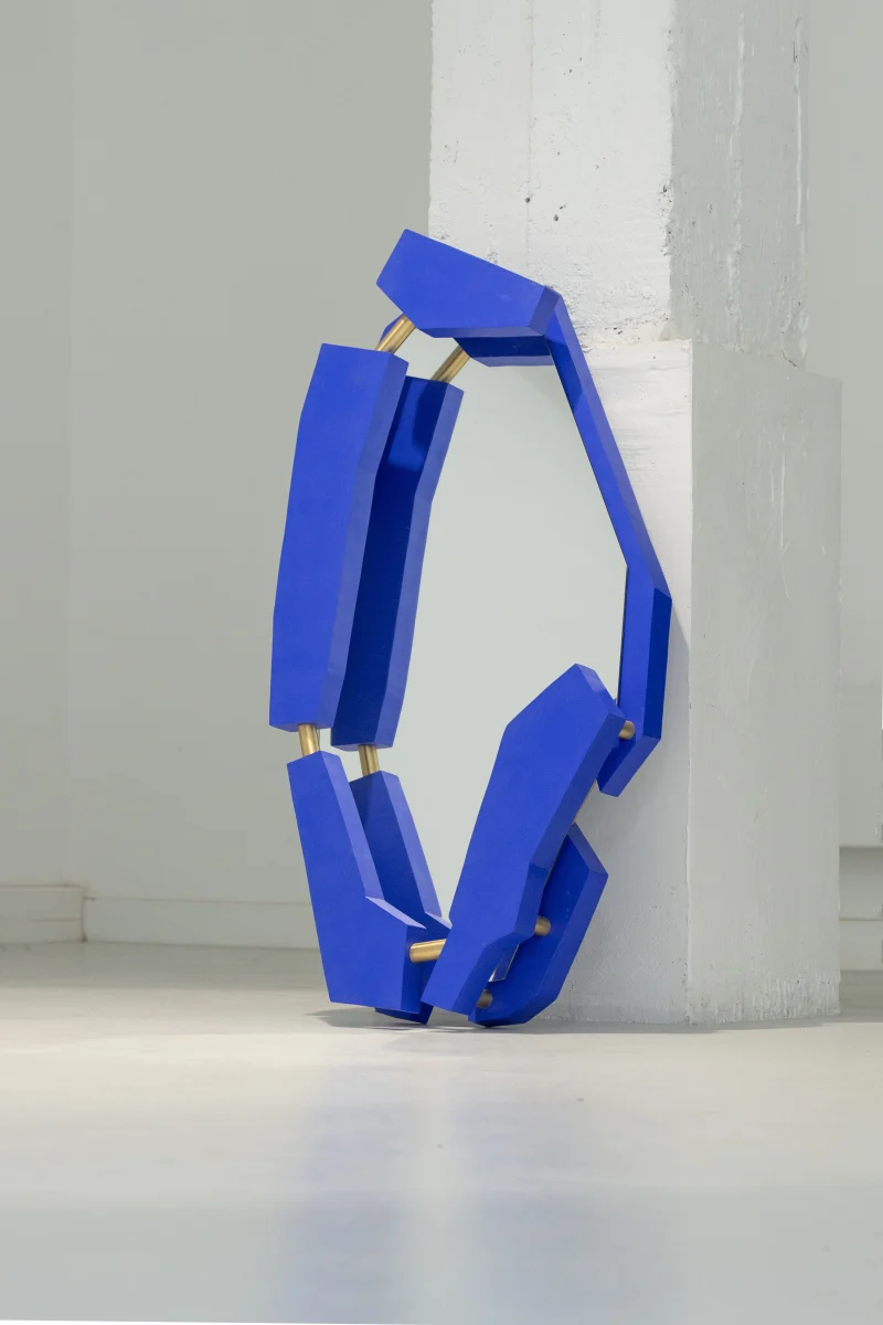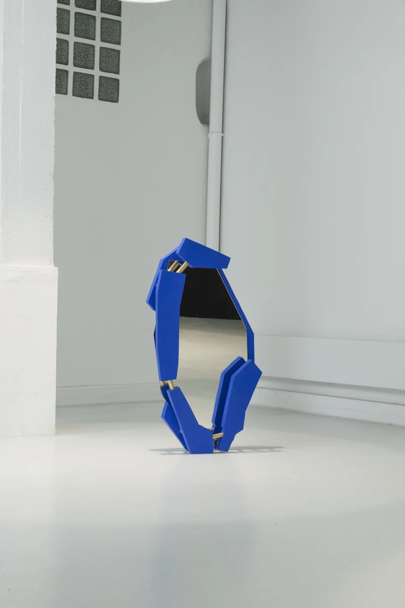 Inspired by the Athena Sanctuary in Delphi, the Last Mirror by Vincent Decat embodies the spirit of its final remnants. This sculptural mirror symbolises resilience and timeless strength. Crafted from hand-cut wood and stainless steel, its design reflects the precise shapes of Delphi’s stones with subtle curved and jagged edges, paying homage to the past while embracing sustainability. The mirror is part of the Ruins of Delphi series, consisting of sculptural furniture pieces reimagining ancient Greece through a contemporary lens. Defined by an unfinished, deconstructed aesthetic, the collection features a chair, bench, and mirror rendered in striking cobalt blue.