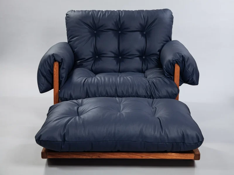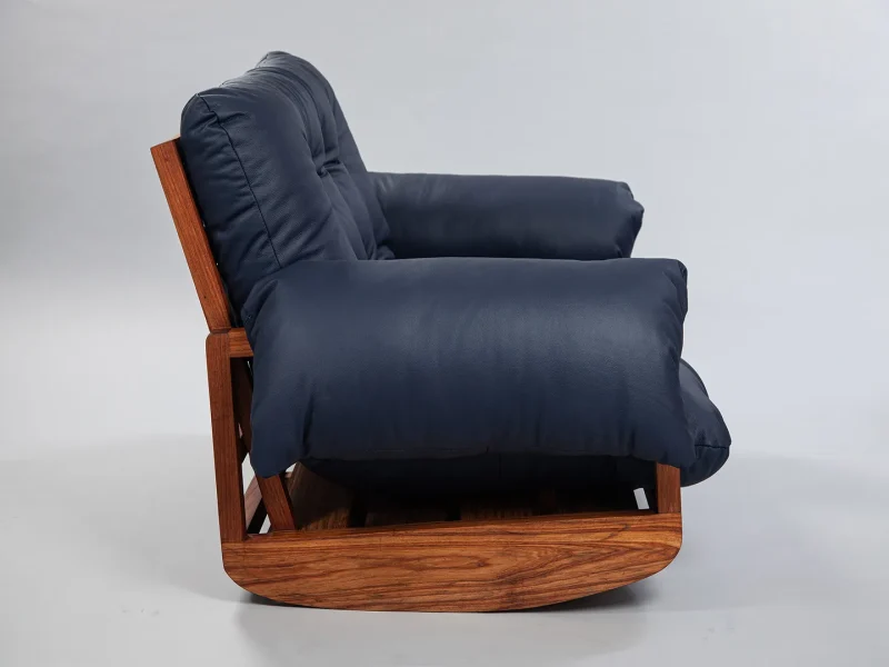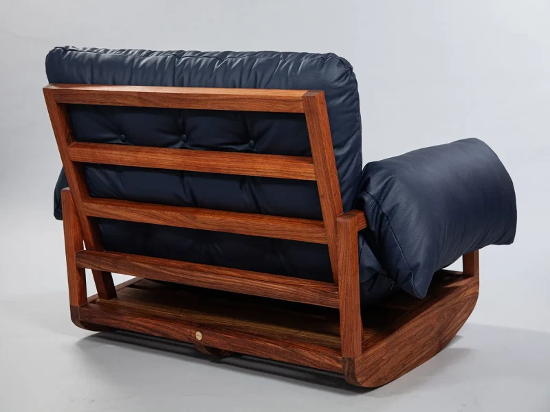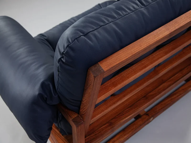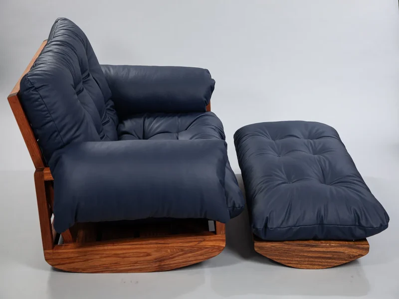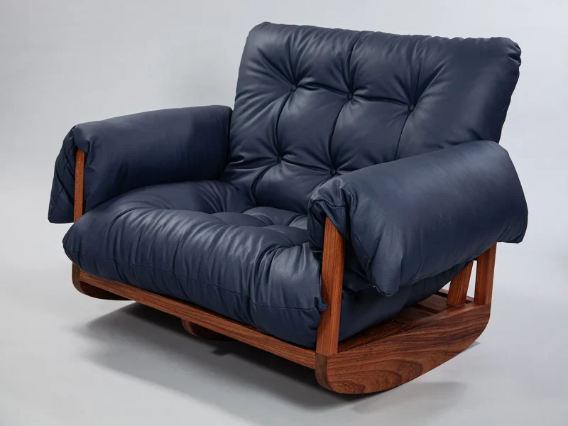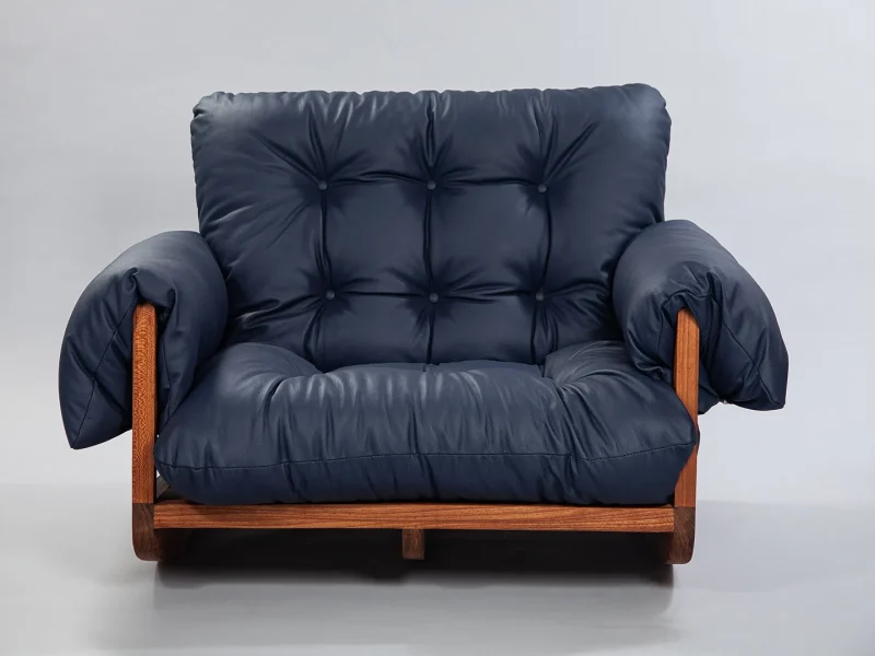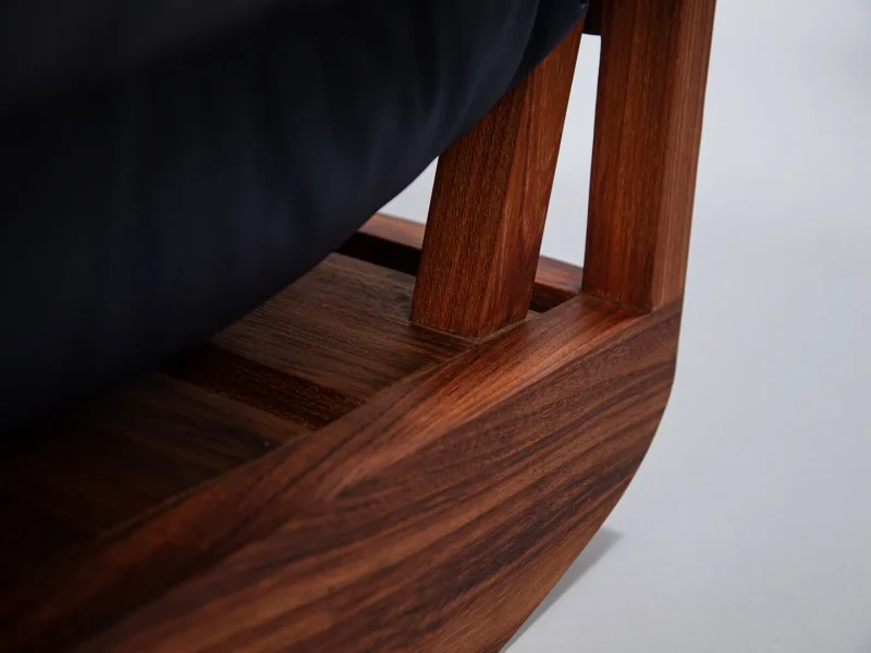 Laziness is a laid-back and spacious rocking armchair, crafted for sitting/lying down and unwinding. The low seat height from the ground draws inspiration from Japanese rocking chairs, while the wooden structure is strongly influenced by Brazilian modernist furniture. Its upholstery is soft and cozy, and can be covered in fabric or leather. This version is produced in solid freijó wood and velvet upholstery