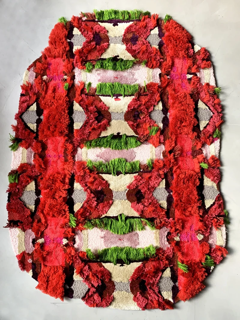 Bright eucalyptus and bamboo wools have been applied in layers and with different textures to evoke varied almost coral landscapes that kiss you.