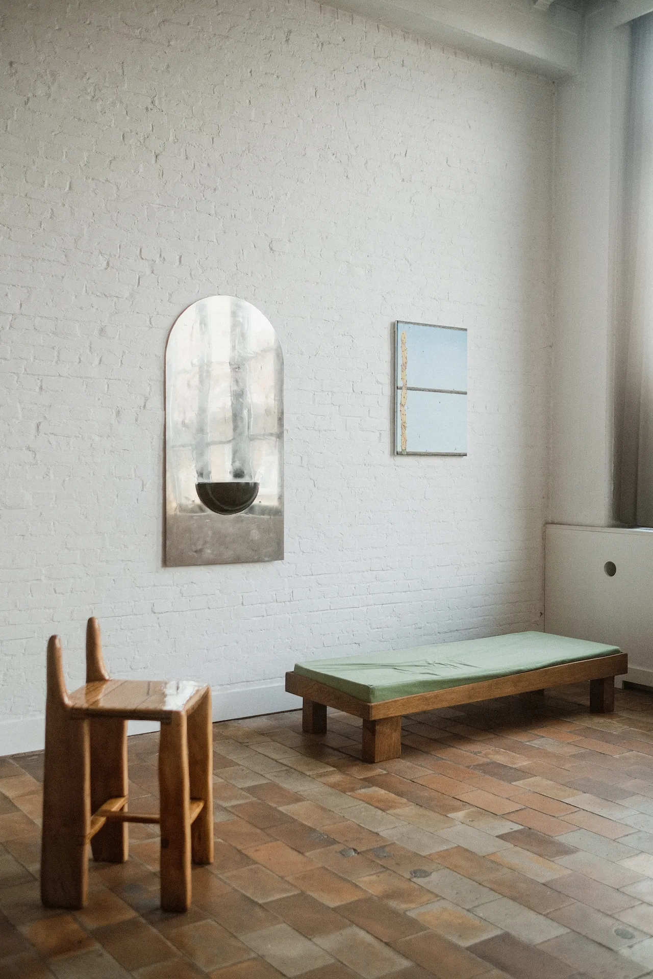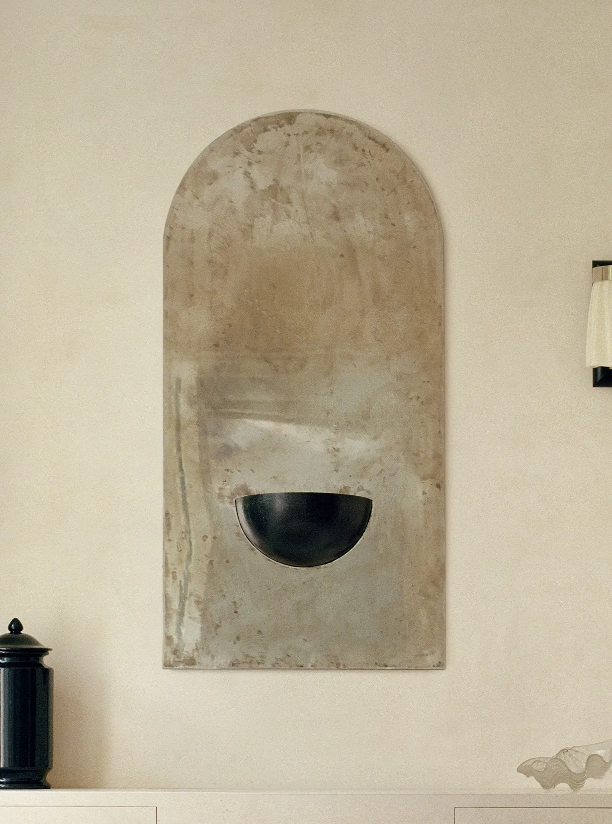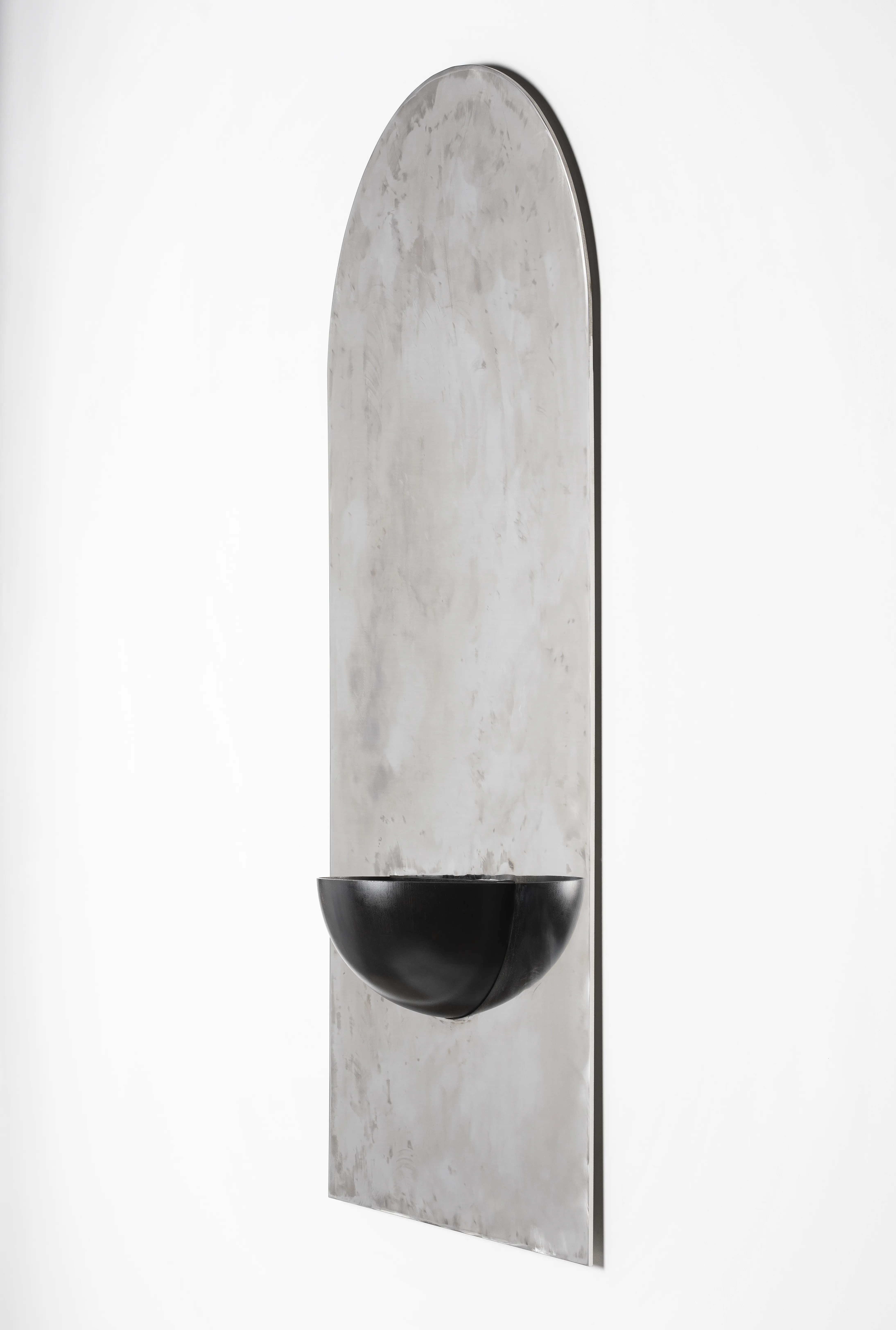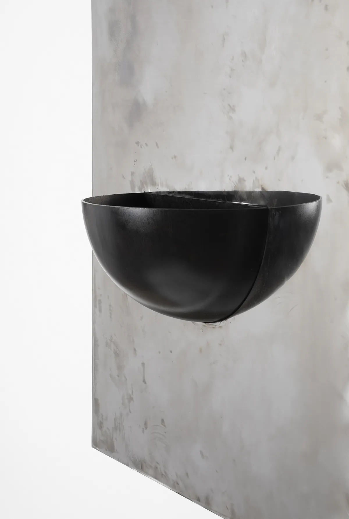 The Mirror of Simple Souls by COSEINCORSO takes inspiration from medieval stoups often found at the entrance of churches and by the Béguines’ beds. The stainless steel plate is brushed by hand leaving a blurry mirrored surface. The iron half-sphere can be used as a small container or be left as an empty spiritual vessel.
