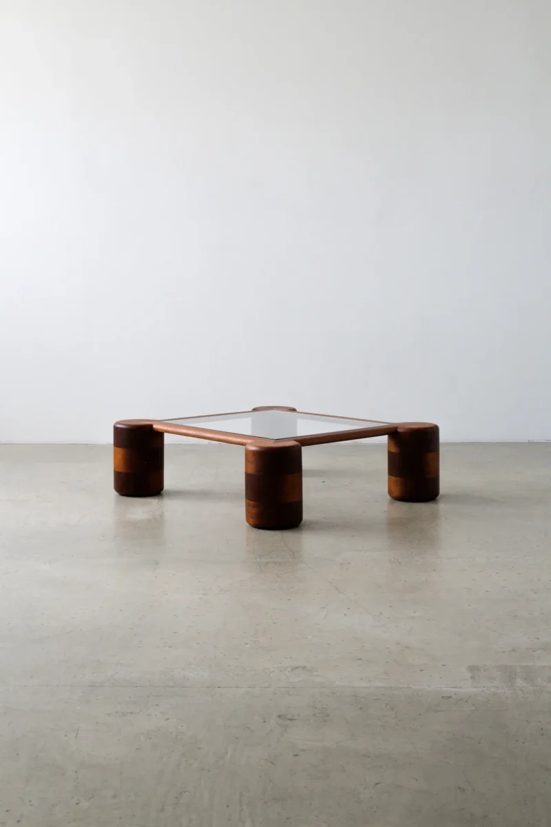 The Pill Box Coffee Table by Don Heston Studio features layered contrasting grain legs and a 6mm reinforced glass tabletop. The interplay of squares and circles, combined with its luxurious curves, creates a truly unique design that serves as a stunning centerpiece in any space.