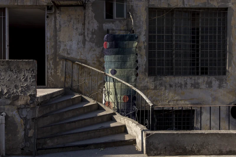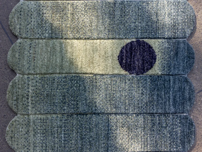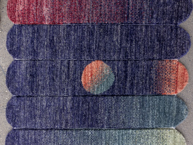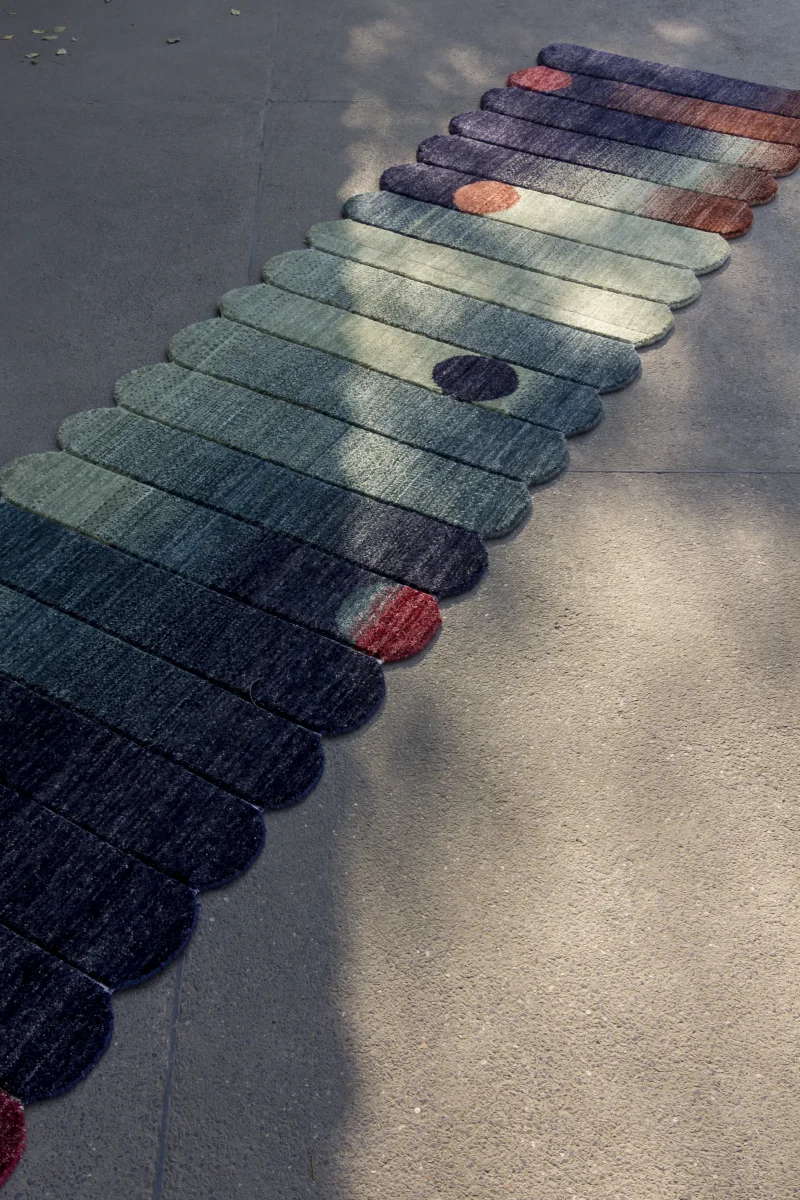 Capturing snippets of the sky, The Runner from The Smog Rug Collection by A* alittlemore studio, is a captivating rug showcasing the sometimes soft, sometimes harsh tones of the sky in response to crop-burning. Intricately showcasing the ever-changing hues in this ill fated season, the rug reflects the atmospheric effects on the land and sky. Hand-knotted threads narrate a tale of growth and decay, from verdant greens and harvest golds to the ethereal blues of the clear sky, the rug depicts the course of nature’s rhythms and human intervention. Encoding the landscape’s seasonal shifts and farming cycles, the soft and harsh tones serve as visual chronicles of nature’s ever-shifting canvas. The Runner prompts reflection on the delicate harmony between human actions and nature, underscoring our part to play in restoring balance.