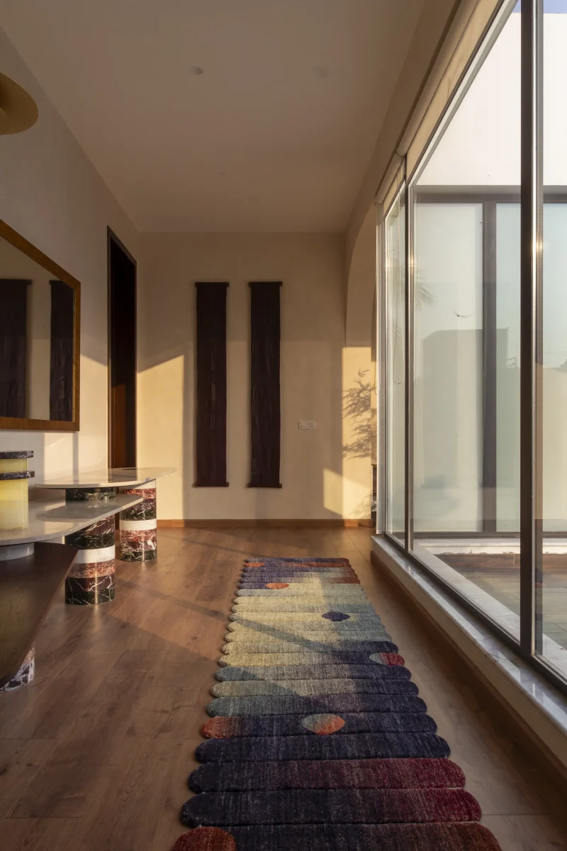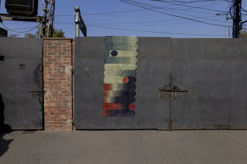 About the collection: A foray into visual storytelling depicting vivid abstractions of the Punjabi Landscape – the collection consists of a series of three hand-knotted rugs made of 100% hand-spun wool. The wool is hand-dyed and the rugs are trimmed meticulously by skilled artisans. What began as a single rug – The Calendar – soon expanded into a series of three limited edition pieces. This collection of rugs is an homage to the land showcasing climate change due to the catastrophic interventions perpetuated by humans. The labor intensive process of carpet making mirrors the hardships endured by farmers desperate to ready the land in time for the next sowing season – in their fervor burning expansive swathes of land that pollutes the land and sky for weeks on end, slowly sapping the once bountiful Punjabi soil of its nutrients.