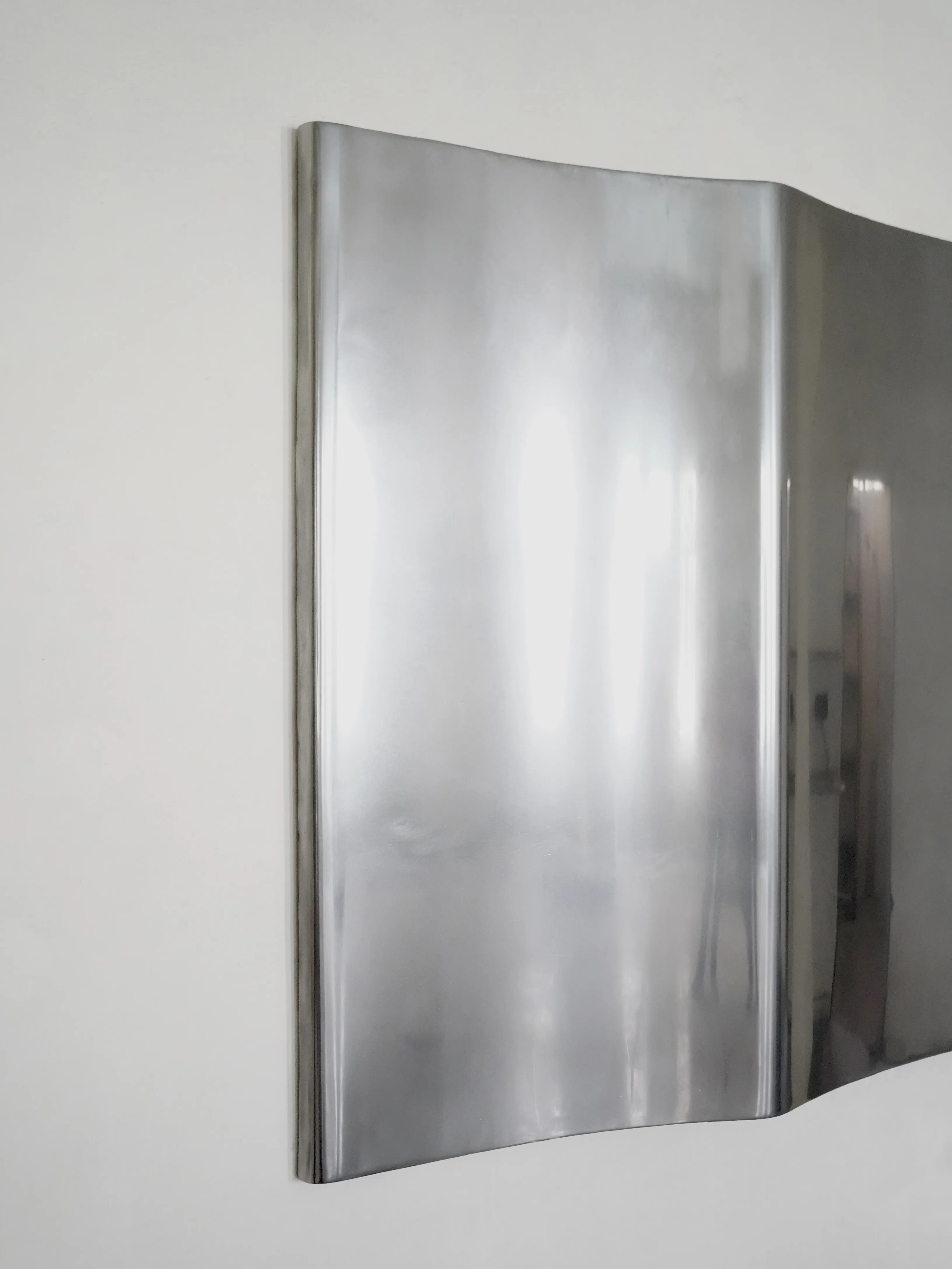 The artwork’s warped aluminium surface embodies this malleability. Its reflective quality offers a tactile experience of time’s fluid nature, subtly hinting at the surrounding environment without presenting a clear, detailed image. Instead, it captures the essence of light, colour, and movement, reflecting how we perceive time in fragmented glimpses. Just as Zeitgebers influences our perception of time, the artwork shifts with each viewpoint, illustrating that while time remains constant, its experience is profoundly subjective and continuously influenced by the external world.