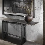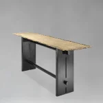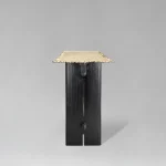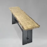 The Transformational Console is an exploration of movement — of journeys made visible through form. A brass top, cast from a wood-and-rope assembly, holds a rhythmic pattern of drilled holes, where lines of passage are punctuated by moments of choice: some paths continue seamlessly, others come to an abrupt end, and still others require a redirection. Beneath this narrative surface, a solid teak wood base — charred and brushed to emphasize its grain — carries the top with quiet resilience. The architectural solidity of the base contrasts with the delicate terrain above, anchoring the piece as both a functional object and a sculptural reflection. In its composition, this console mirrors life’s unseen maps — where progression, rupture and adaptation are always intertwined.
