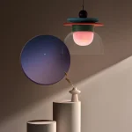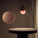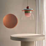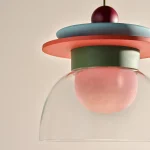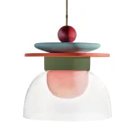 The pendant light Theia consists of a bell-shaped transparent glass, behind which a pink pigmented glass encloses the light body. In addition, there are four ceramic shapes, painted in the colours light green, orange, light blue, and dark red-violet with a matte finish. A suspension tube made of sturdy iron, coloured in gold-silver, holds the lamp stable and securely, with the length of the suspension being adjustable. The pendant lamp Theia was handcrafted, making each piece a unique item. Due to this individual manufacturing, the lamps may vary in material and surface from the model shown in the photos. The weight may vary by 1-2 kg, as it is a handmade product.