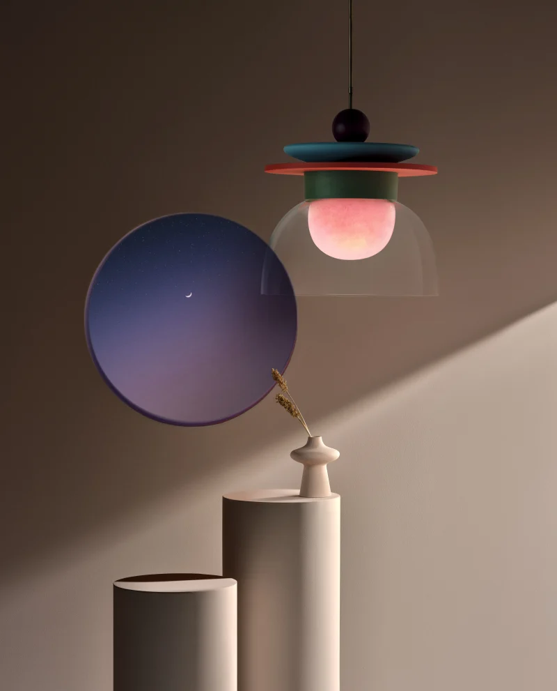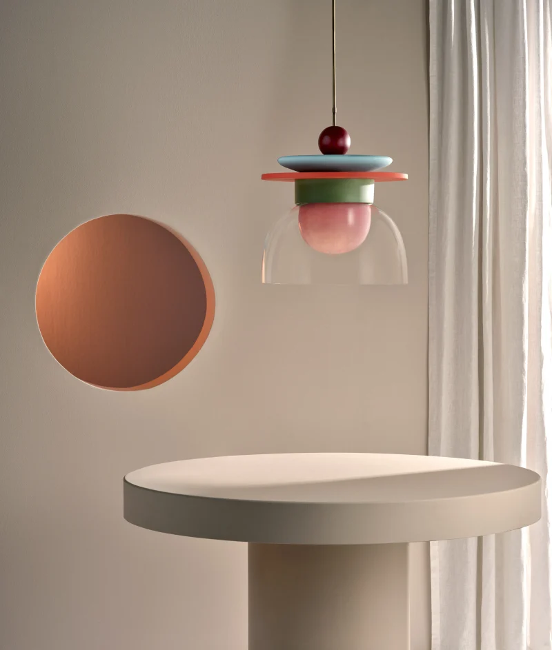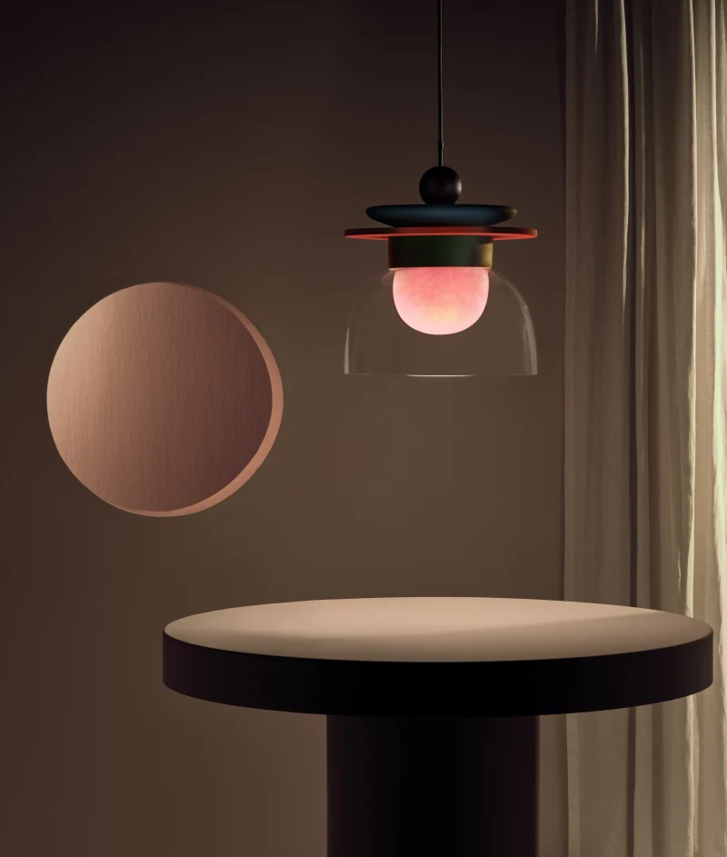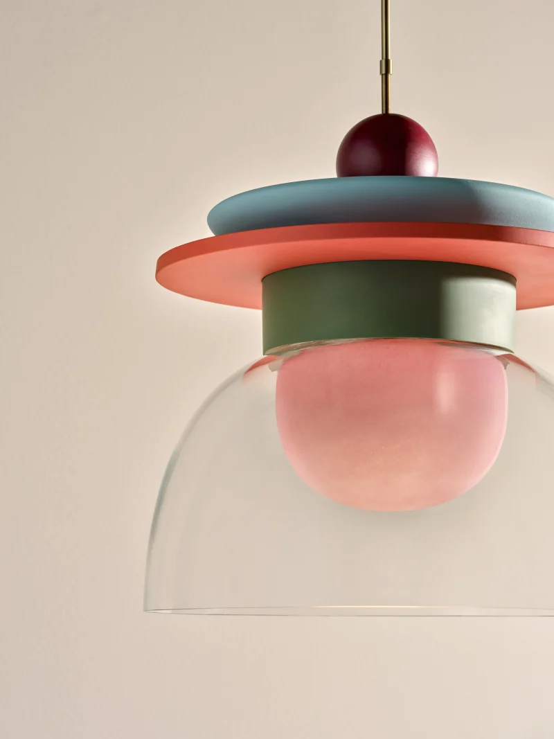 The pendant light Theia consists of a bell-shaped transparent glass, behind which a pink pigmented glass encloses the light body. In addition, there are four ceramic shapes, painted in the colours light green, orange, light blue, and dark red-violet with a matte finish. A suspension tube made of sturdy iron, coloured in gold-silver, holds the lamp stable and securely, with the length of the suspension being adjustable. The pendant lamp Theia was handcrafted, making each piece a unique item. Due to this individual manufacturing, the lamps may vary in material and surface from the model shown in the photos. The weight may vary by 1-2 kg, as it is a handmade product.