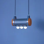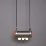 The three-bulb pendant light by Nolan T.K. utilizes standard drop ceiling fasteners for suspension, combining practicality with industrial charm. The perforated metal tube houses visible bulbs that screw directly into the fixture, seamlessly interfacing with the collars to create a refined and sophisticated luminaire.