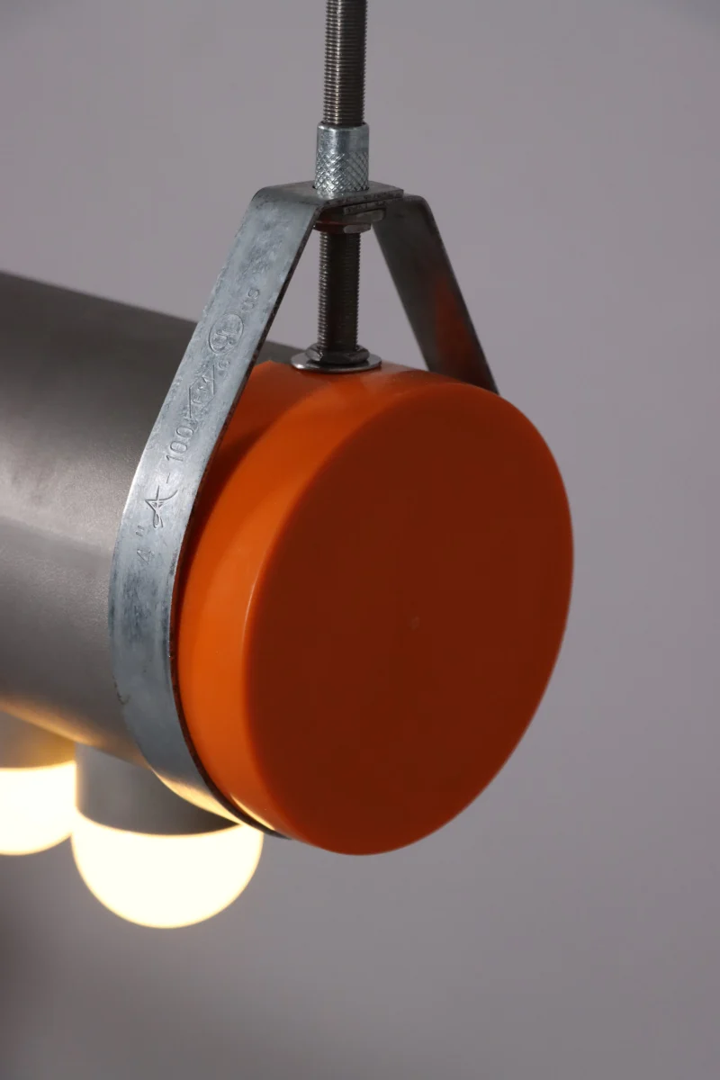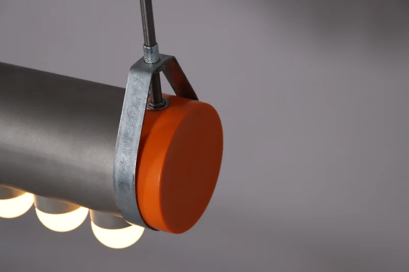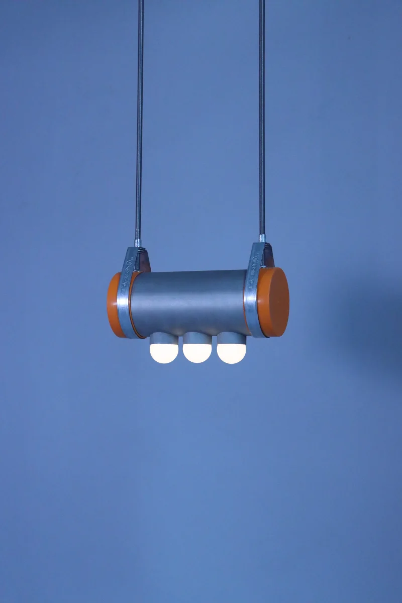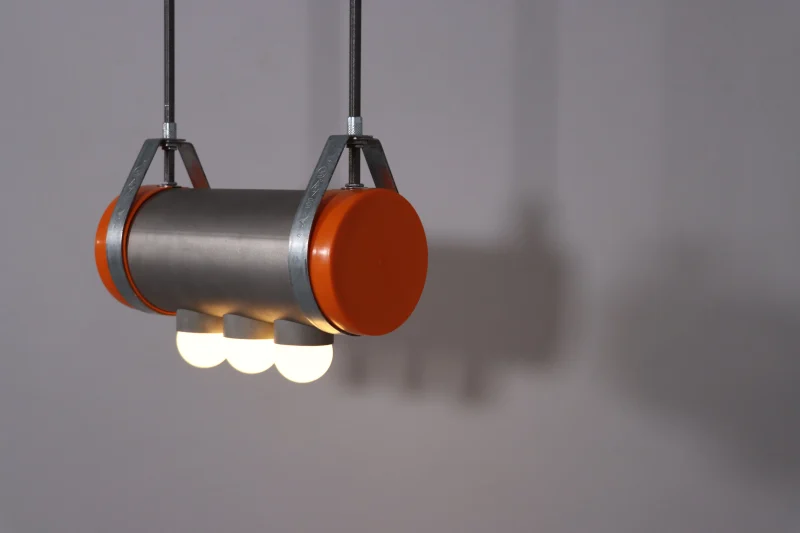 Bright PVC end caps add a pop of color while encasing the internal electrical wiring. The design balances simplicity and ingenuity, transforming everyday materials into a striking and contemporary lighting solution.