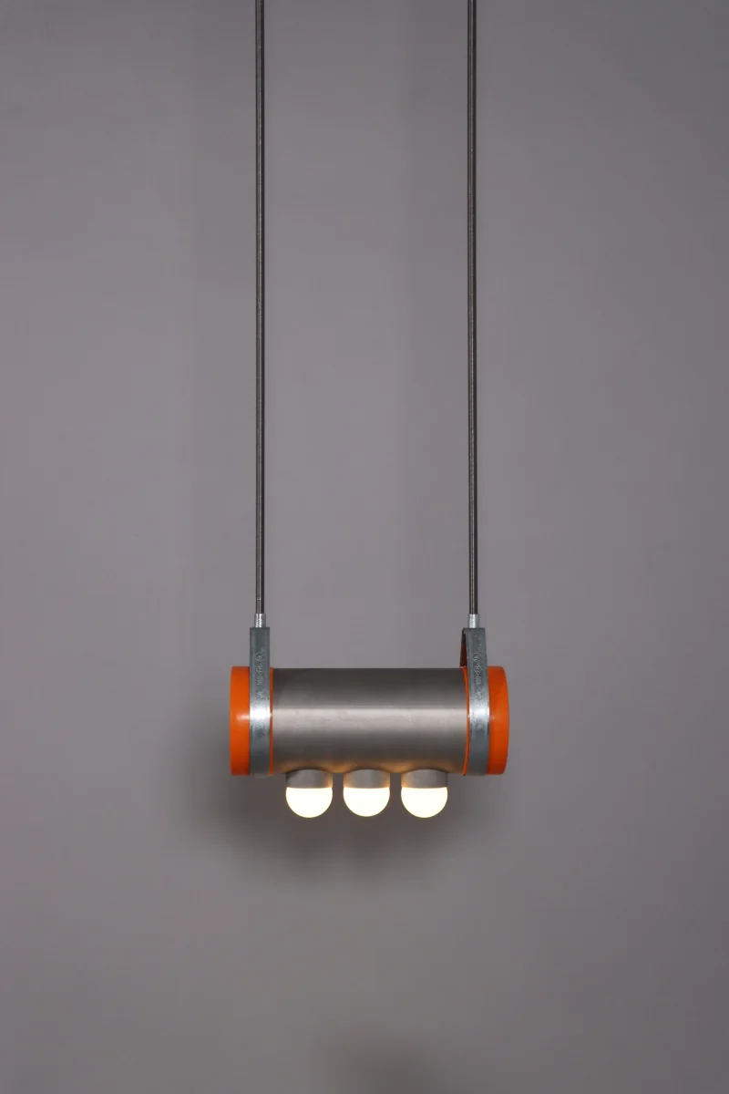 The three-bulb pendant light by Nolan T.K. utilizes standard drop ceiling fasteners for suspension, combining practicality with industrial charm. The perforated metal tube houses visible bulbs that screw directly into the fixture, seamlessly interfacing with the collars to create a refined and sophisticated luminaire.