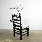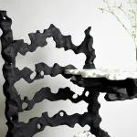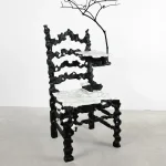 This bespoke hand carved art object by Gábor Góbi is crafted from a repurposed dinning chair and remnants of white marble. This sculptural piece has been enhanced by fire-burning the wood using the Yakisugi technique and is elegantly finished with natural oil and beeswax.