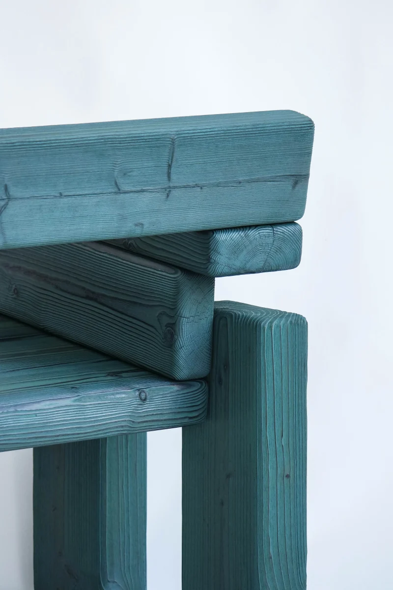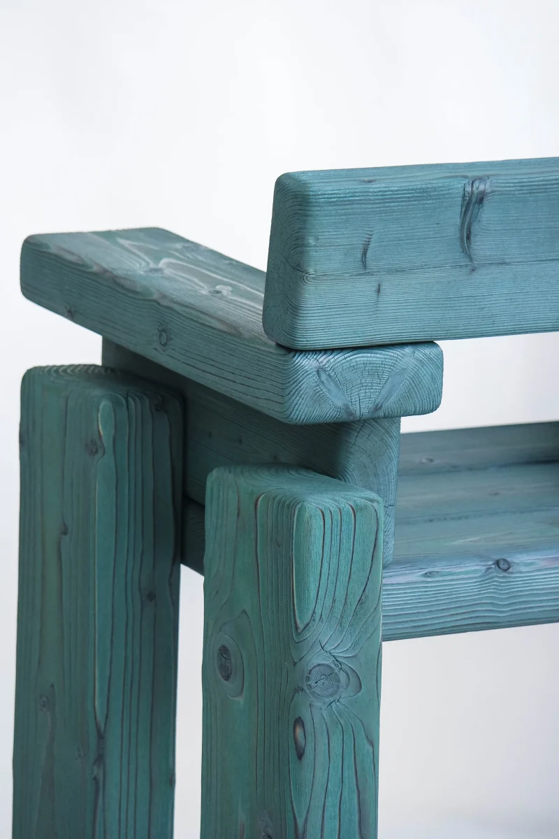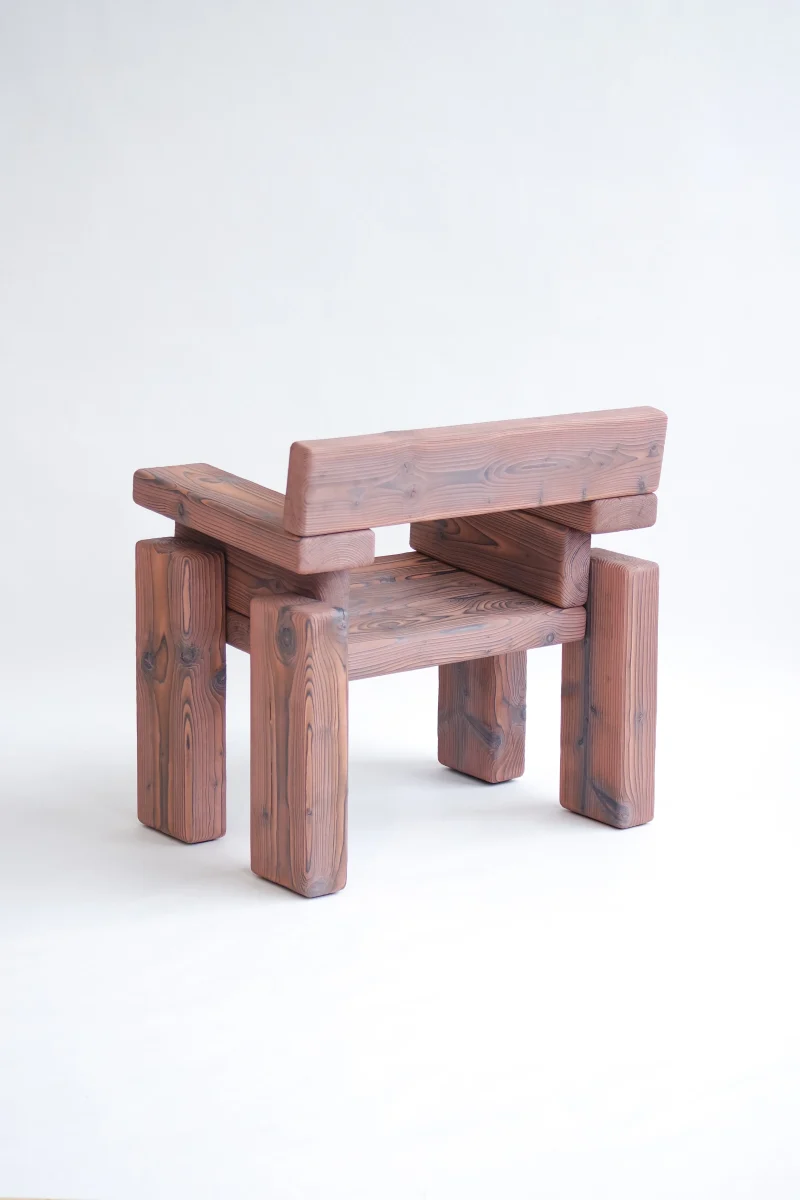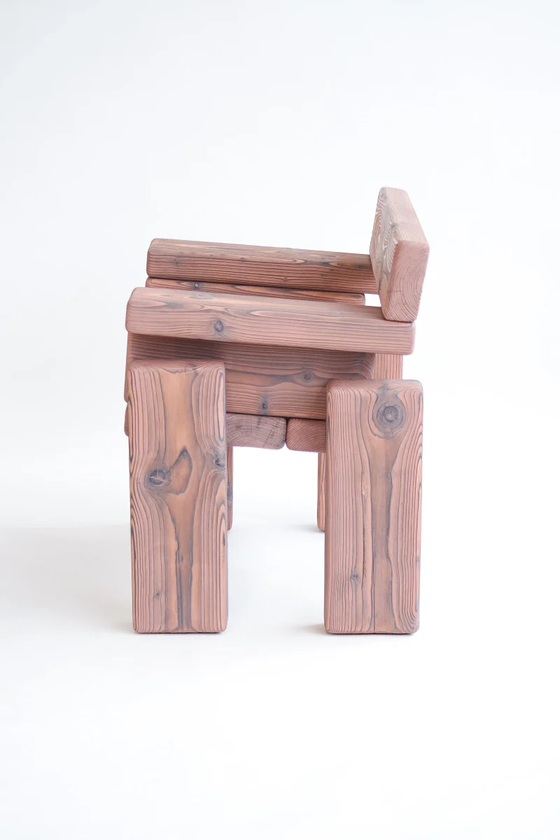What makes the Timber Armchair truly distinctive is its honest approach to materials. While construction beams are typically associated with mass production, rounded corners soften the form, enhancing the natural wood grain and subtly revealing its organic origins. Each beam tells the story of a tree from the forest, bringing a sense of authenticity and natural beauty into a modern context.