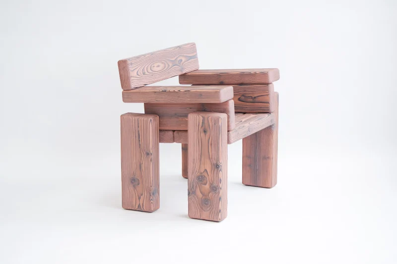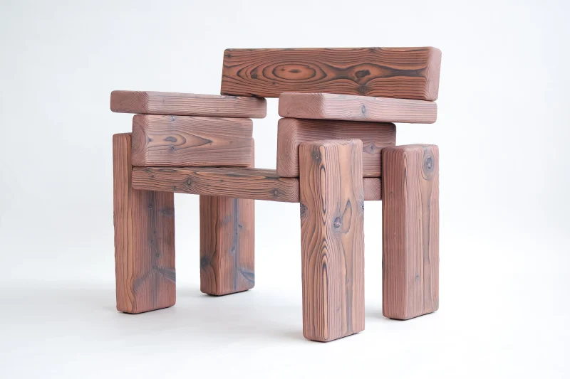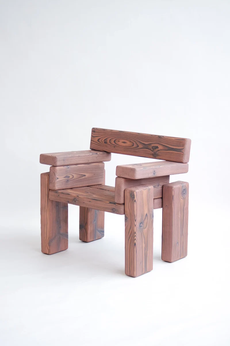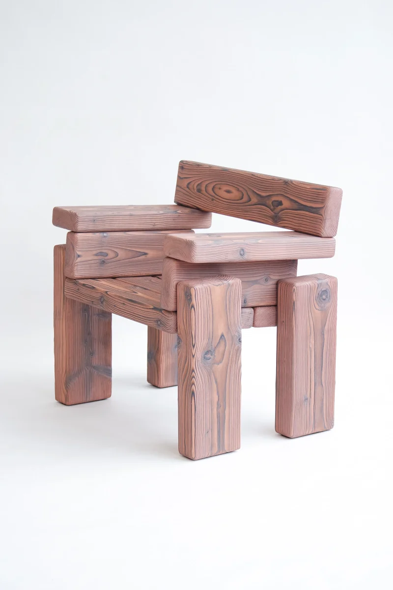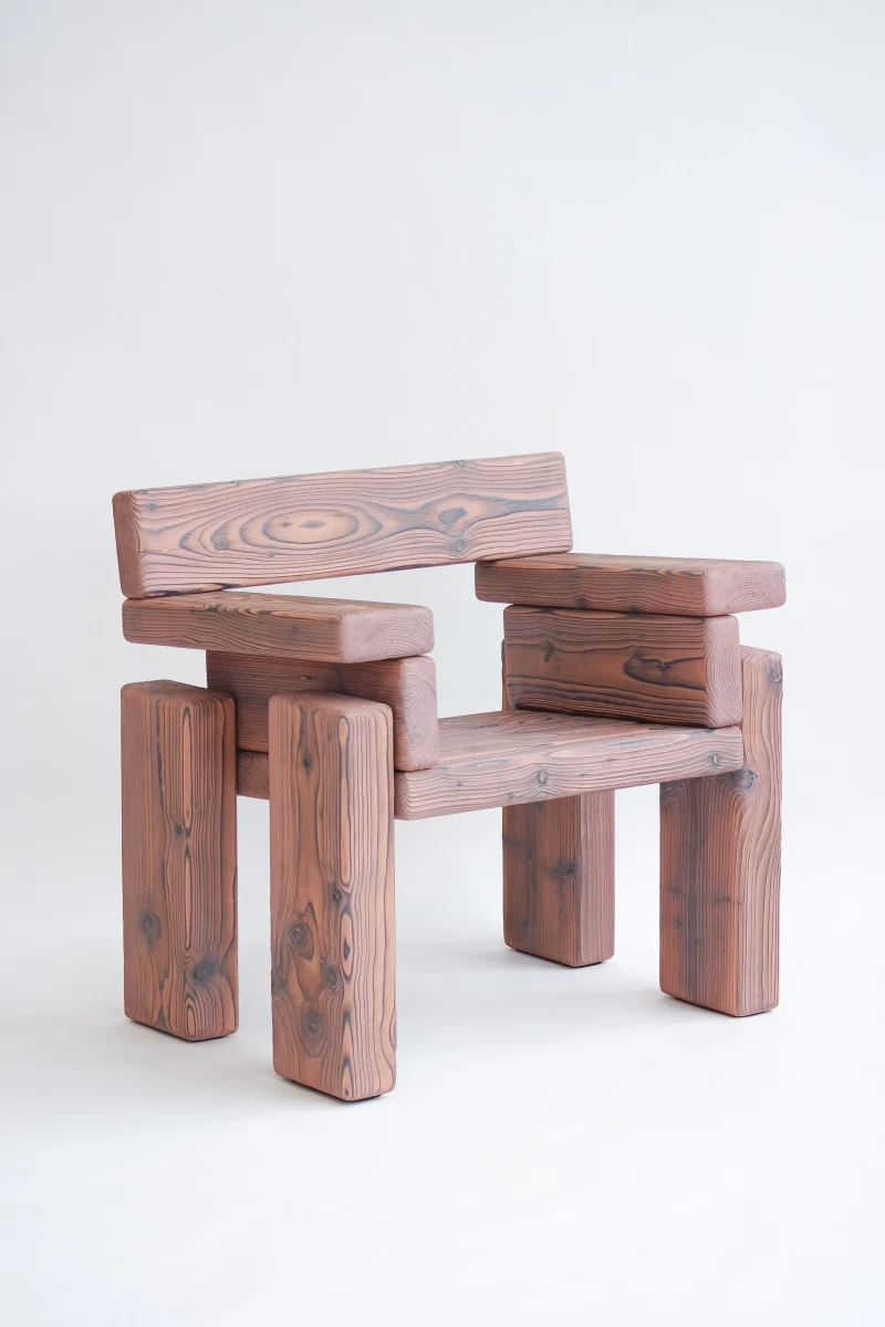 The Timber Burned Pine Armchair by Studio Onno Adriaanse reimagines standardized construction beams into a bold, sculptural seating design, transforming industrial materials into artful furniture. By combining modular wooden blocks, the armchair achieves an unexpected design aesthetic that balances raw materiality with refined craftsmanship.