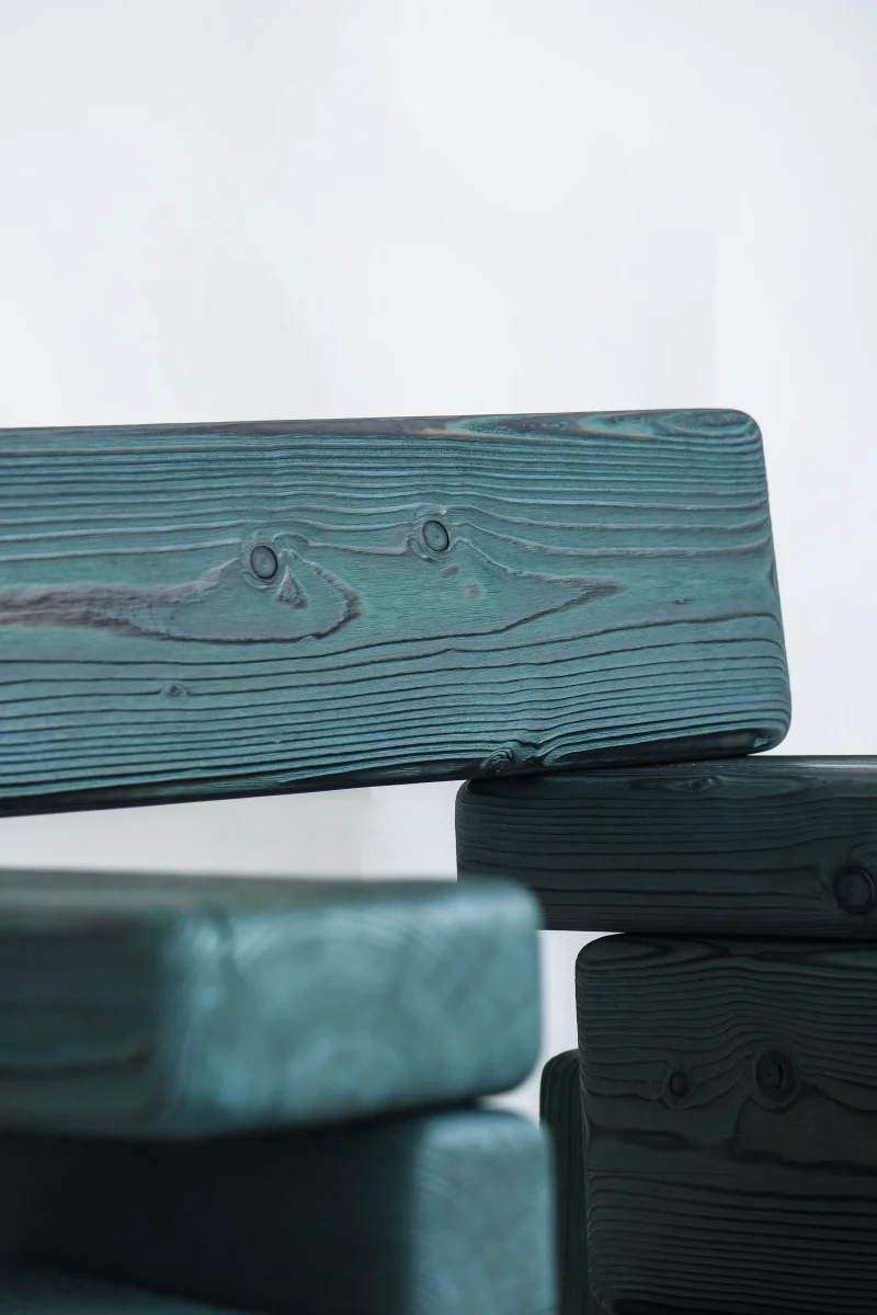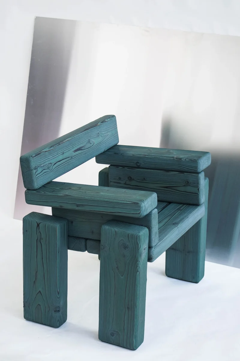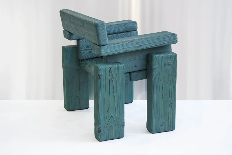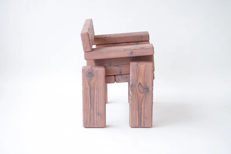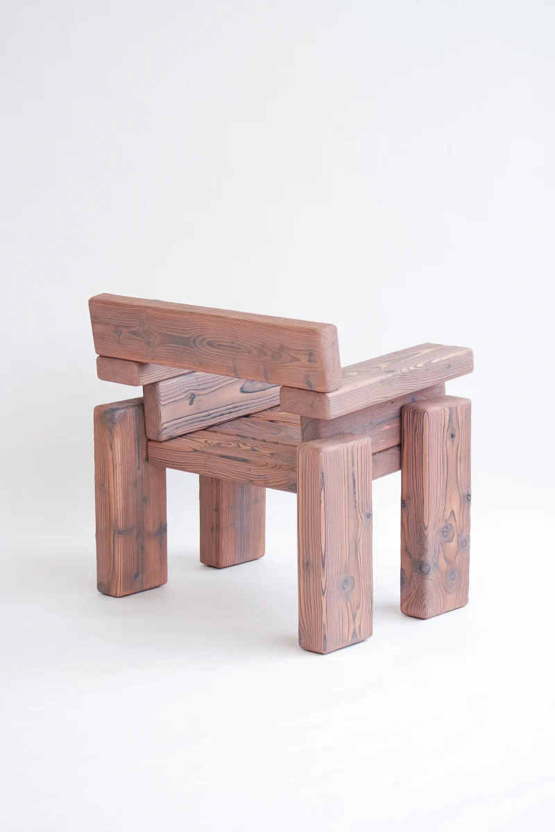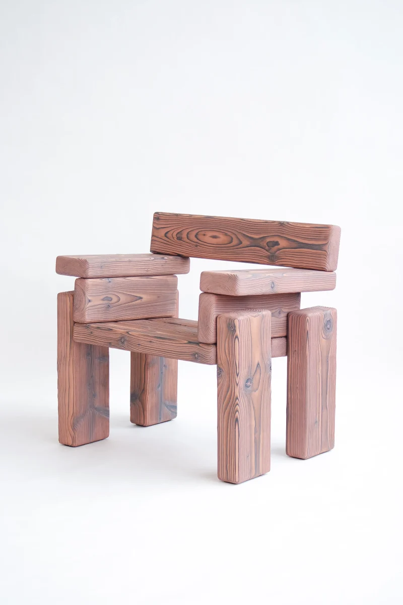 The Timber Burned Pine Armchair by Studio Onno Adriaanse reimagines standardized construction beams into a bold, sculptural seating design, transforming industrial materials into artful furniture. By combining modular wooden blocks, the armchair achieves an unexpected design aesthetic that balances raw materiality with refined craftsmanship.
