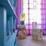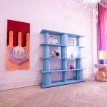 Made of solid pine wood that has been stained light blue, the piece maintain a level of familiarity and tactility while the blue color adds a playful and airy feel.