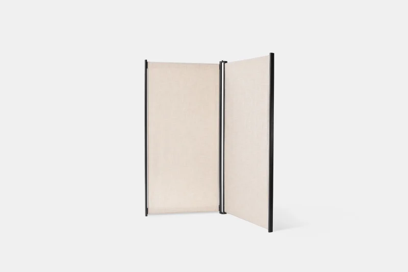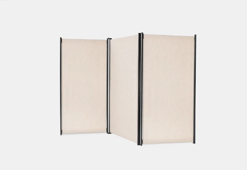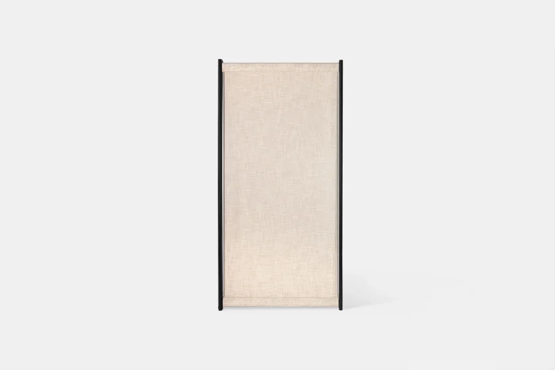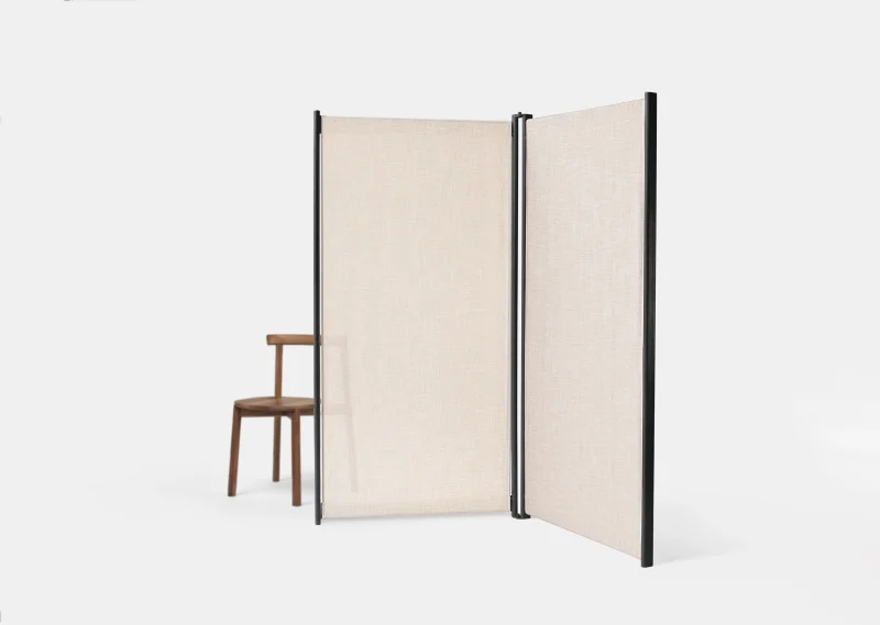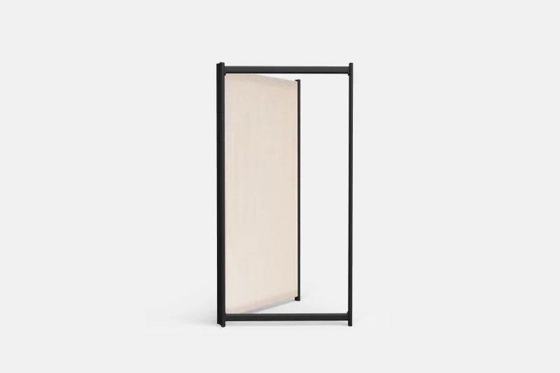 Tirai is a free standing room divider system with an airy, clean and minimalistic look. The entire system consists of three components: the metal framework; the fabric and the flats. This extremely light and especially mobile room divider can be reconstructed and repositioned over and over. The metal framework comes in black powder- coated finish with a light cream colour sheer-linen fabric around.