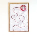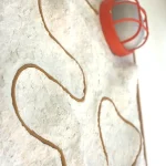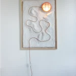 The TOPO Lamp by B.C. Joshua is a new series of wall-hanging functional canvases inspired by adventurers and explorers of old, referencing design language from old mine shafts and topographic maps. The sinuous lighting cable is used as a focal point, travelling through an undulating terrain until it reaches the metal cage lamp which shines downwards reflecting off the graded surface.