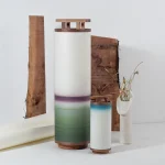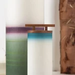 It is made of two cylindric landscapes dyed on washi paper and rolled around a walnut hold evoking the Torii, a symbolic portal towards the spiritual realm.